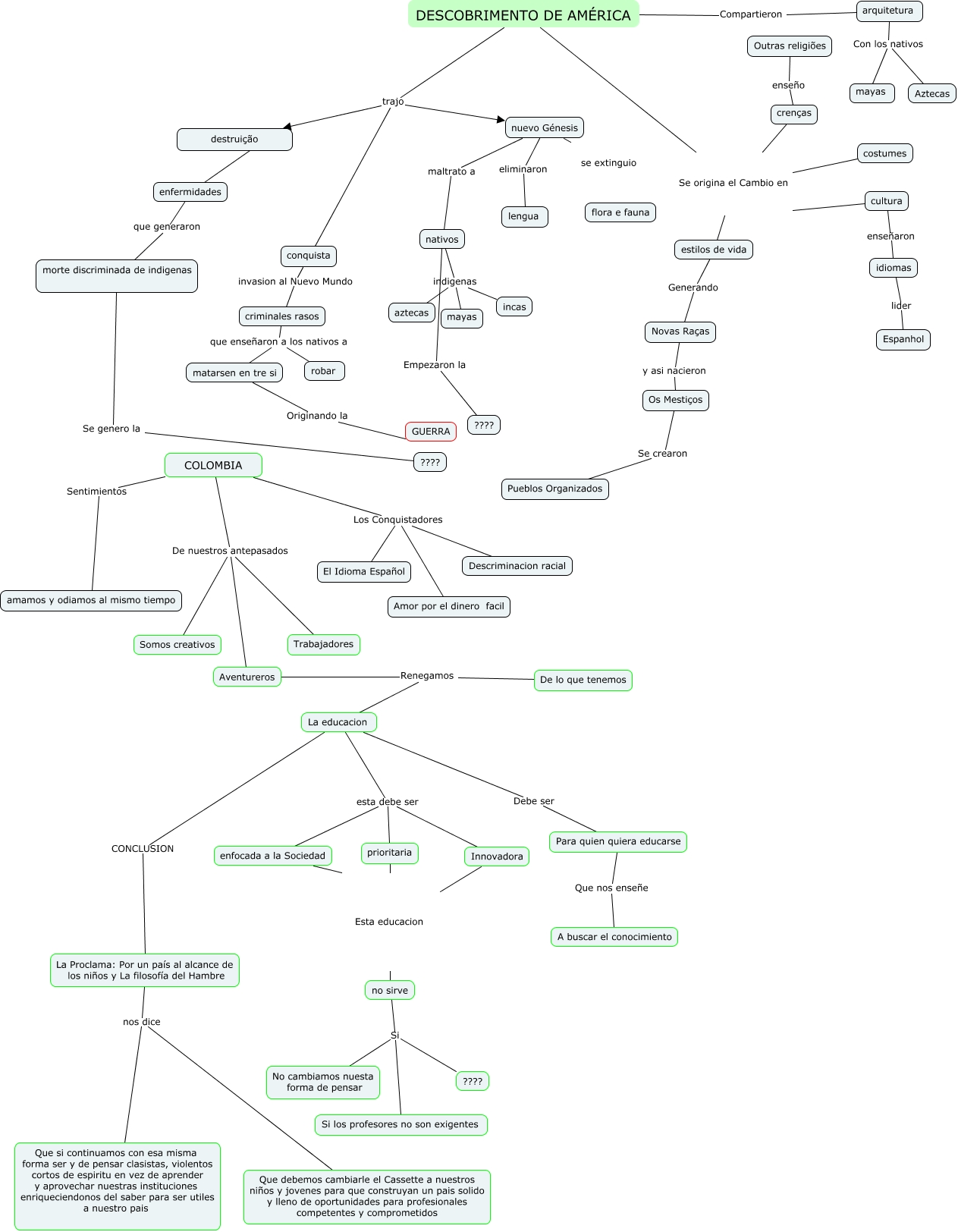 Questa Cmap, creata con IHMC CmapTools, contiene informazioni relative a: Escuela de Vida, La educacion CONCLUSION La Proclama: Por un país al alcance de los niños y La filosofía del Hambre, La educacion esta debe ser enfocada a la Sociedad, COLOMBIA Los Conquistadores Descriminacion racial, COLOMBIA Sentimientos amamos y odiamos al mismo tiempo, idiomas lider Espanhol, DESCOBRIMENTO DE AMÉRICA Compartieron arquitetura, destruição ???? enfermidades, DESCOBRIMENTO DE AMÉRICA trajo nuevo Génesis, COLOMBIA De nuestros antepasados Aventureros, COLOMBIA Los Conquistadores El Idioma Español, crenças enseño Outras religiões, La Proclama: Por un país al alcance de los niños y La filosofía del Hambre nos dice Que si continuamos con esa misma forma ser y de pensar clasistas, violentos cortos de espiritu en vez de aprender y aprovechar nuestras instituciones enriqueciendonos del saber para ser utiles a nuestro pais, Aventureros Renegamos La educacion, cultura enseñaron idiomas, no sirve Si Si los profesores no son exigentes, Para quien quiera educarse Que nos enseñe A buscar el conocimiento, Aventureros Renegamos De lo que tenemos, DESCOBRIMENTO DE AMÉRICA Se origina el Cambio en estilos de vida, conquista invasion al Nuevo Mundo criminales rasos, prioritaria Esta educacion no sirve
