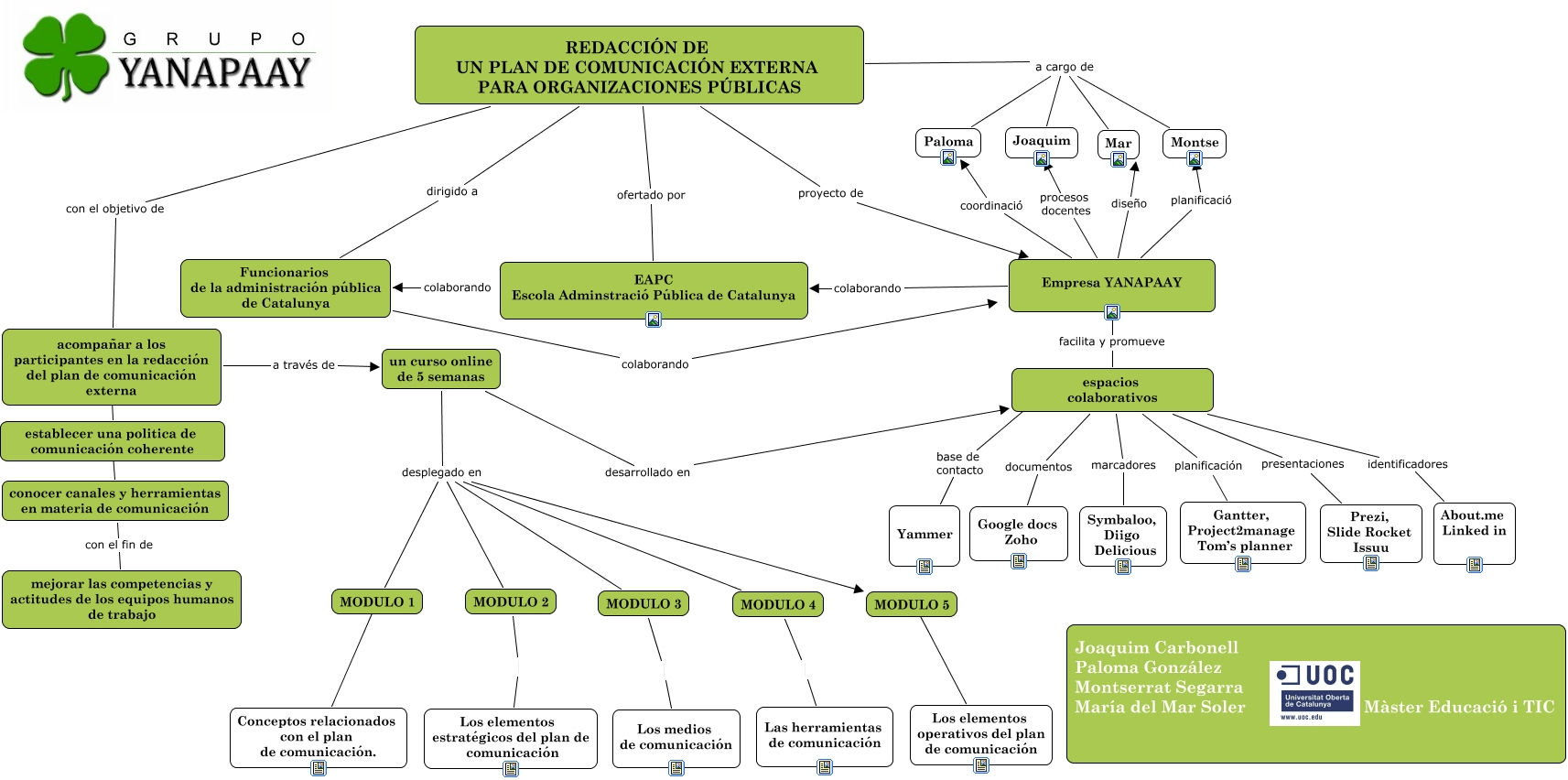 Este Cmap, tiene información relacionada con: Yanapaay PAC2, Empresa YANAPAAY procesos docentes Joaquim, REDACCIÓN DE UN PLAN DE COMUNICACIÓN EXTERNA PARA ORGANIZACIONES PÚBLICAS a cargo de Mar, establecer una politica de comunicación coherente ???? conocer canales y herramientas en materia de comunicación, un curso online de 5 semanas desarrollado en espacios colaborativos, espacios colaborativos planificación Gantter, Project2manage Tom’s planner, REDACCIÓN DE UN PLAN DE COMUNICACIÓN EXTERNA PARA ORGANIZACIONES PÚBLICAS ofertado por EAPC Escola Adminstració Pública de Catalunya, un curso online de 5 semanas desplegado en MODULO 5, espacios colaborativos documentos Google docs Zoho, REDACCIÓN DE UN PLAN DE COMUNICACIÓN EXTERNA PARA ORGANIZACIONES PÚBLICAS dirigido a Funcionarios de la administración pública de Catalunya, un curso online de 5 semanas desplegado en MODULO 3, Empresa YANAPAAY facilita y promueve espacios colaborativos, espacios colaborativos marcadores Symbaloo, Diigo Delicious, REDACCIÓN DE UN PLAN DE COMUNICACIÓN EXTERNA PARA ORGANIZACIONES PÚBLICAS proyecto de Empresa YANAPAAY, un curso online de 5 semanas desplegado en MODULO 4, base de contacto Yammer, espacios colaborativos presentaciones Prezi, Slide Rocket Issuu, MODULO 1 Conceptos relacionados con el plan de comunicación., Funcionarios de la administración pública de Catalunya colaborando, MODULO 2 Los elementos estratégicos del plan de comunicación, MODULO 4 Las herramientas de comunicación