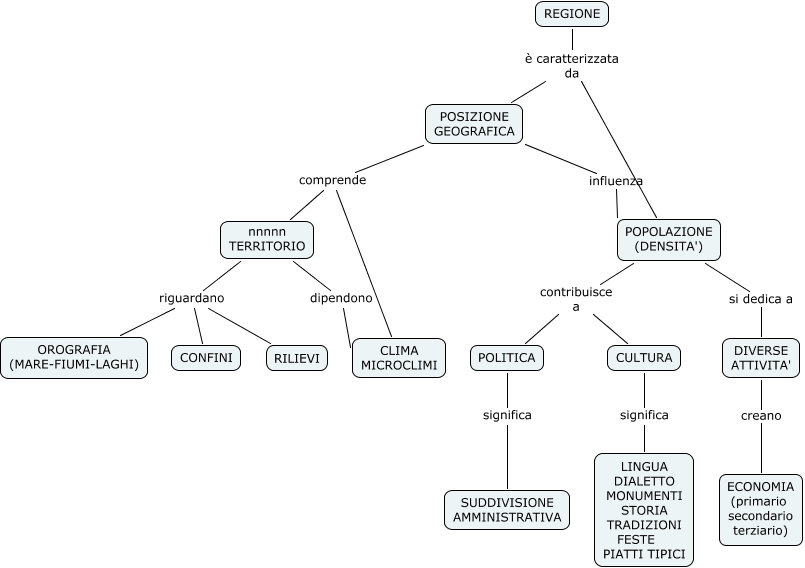 Questa Cmap, creata con IHMC CmapTools, contiene informazioni relative a: reg, nnnnn TERRITORIO riguardano RILIEVI, CULTURA significa LINGUA DIALETTO MONUMENTI STORIA TRADIZIONI FESTE PIATTI TIPICI, POPOLAZIONE (DENSITA') si dedica a DIVERSE ATTIVITA', POSIZIONE GEOGRAFICA influenza POPOLAZIONE (DENSITA'), DIVERSE ATTIVITA' creano ECONOMIA (primario secondario terziario), POLITICA significa SUDDIVISIONE AMMINISTRATIVA, REGIONE è caratterizzata da POPOLAZIONE (DENSITA'), nnnnn TERRITORIO dipendono CLIMA MICROCLIMI, POPOLAZIONE (DENSITA') contribuisce a CULTURA, REGIONE è caratterizzata da POSIZIONE GEOGRAFICA, nnnnn TERRITORIO riguardano OROGRAFIA (MARE-FIUMI-LAGHI), POPOLAZIONE (DENSITA') contribuisce a POLITICA, nnnnn TERRITORIO riguardano CONFINI, POSIZIONE GEOGRAFICA comprende nnnnn TERRITORIO, POSIZIONE GEOGRAFICA comprende CLIMA MICROCLIMI