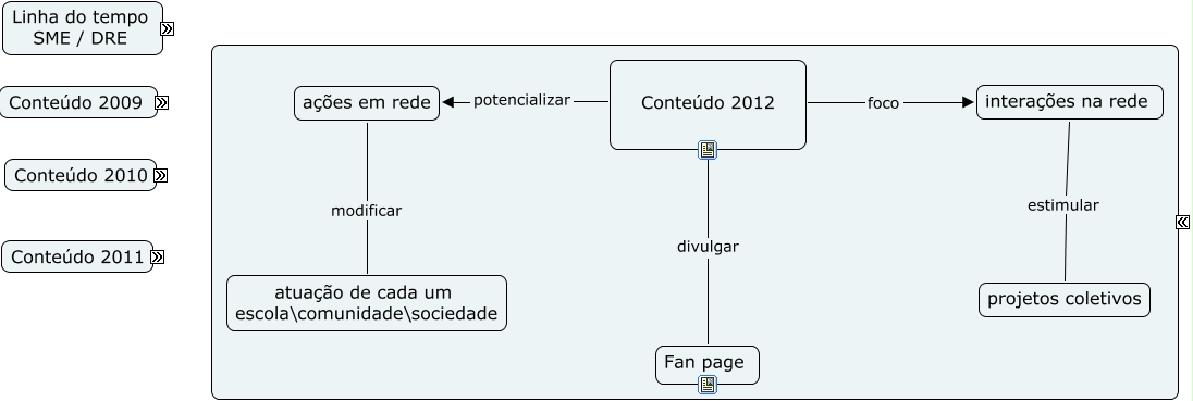Esse mapa conceitual, produzido no IHMC CmapTools, tem a informação relacionada a: Conteudo 2012, aluno produtor WEB desencadeia novos processos de produção animação em video, Blog criação Conteúdo 2009, DRE Jaçanã/Trmemebé acompanha 140 escolas 70 POIE, modalidades prioriza 70 POIE, interações na rede estimular projetos coletivos, Conteúdo 2011 foco vínculo professor \ aluno, SME Secretaria do Município de São Paulo atende 13 Diretorias Regionais, SME Secretaria do Município de São Paulo publica orientações curriculares, Conteúdo 2012 potencializar ações em rede, facebook Twitter participar aluno gestor de sua própria rede, Fotografia contribui identidade digital, Conteúdo 2012 divulgar Fan page, 13 Diretorias Regionais desenvolvem pela formação docente de cada equipe / Informática Educativa, ações em rede modificar atuação de cada um escola\comunidade\sociedade, redes sociais digitais uso facebook Twitter, projetos avalia ????, modalidades sistematiza Ensino Médio EJA EMEBS, Conteúdo 2011 I Jornada de Tecnologia, Conteúdo 2009 por meio Mapa Conceitual, modalidades adequa Educação Infantil