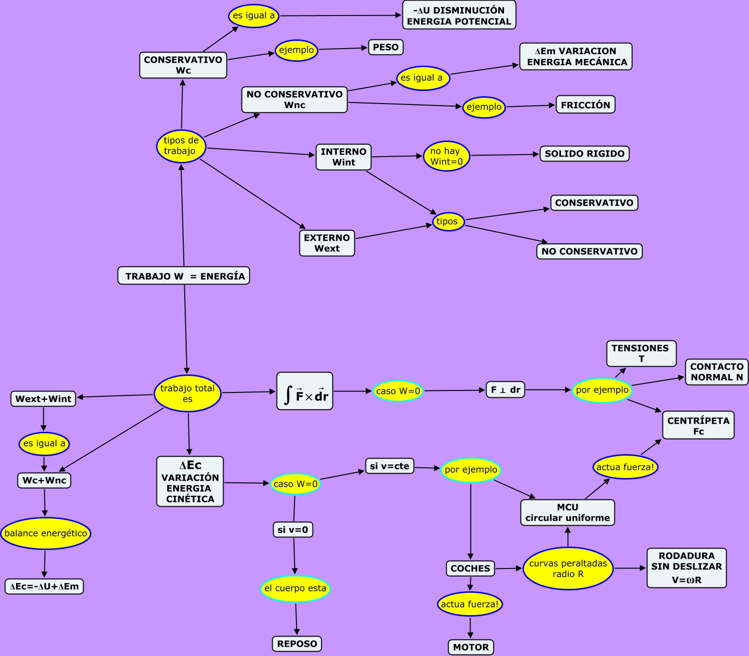 Este Cmap, tiene información relacionada con: TRABAJO_judit@fa.upc.edu, COCHES curvas peraltadas radio R MCU circular uniforme, TRABAJO W = ENERGÍA tipos de trabajo INTERNO Wint, INTERNO Wint tipos NO CONSERVATIVO, CONSERVATIVO Wc es igual a -ΔU DISMINUCIÓN ENERGIA POTENCIAL, F ⊥ dr por ejemplo CONTACTO NORMAL N, Wc+Wnc balance energético ΔEc=-ΔU+ΔEm, TRABAJO W = ENERGÍA tipos de trabajo EXTERNO Wext, ΔEc VARIACIÓN ENERGIA CINÉTICA caso W=0 si v=0, EXTERNO Wext tipos NO CONSERVATIVO, TRABAJO W = ENERGÍA trabajo total es Wc+Wnc, TRABAJO W = ENERGÍA trabajo total es ΔEc VARIACIÓN ENERGIA CINÉTICA, NO CONSERVATIVO Wnc es igual a ΔEm VARIACION ENERGIA MECÁNICA, COCHES curvas peraltadas radio R RODADURA SIN DESLIZAR V=ωR, si v=0 el cuerpo esta REPOSO, NO CONSERVATIVO Wnc ejemplo FRICCIÓN, INTERNO Wint no hay Wint=0 SOLIDO RIGIDO, Wext+Wint es igual a Wc+Wnc, MCU circular uniforme actua fuerza! CENTRÍPETA Fc, F ⊥ dr por ejemplo TENSIONES T, ΔEc VARIACIÓN ENERGIA CINÉTICA caso W=0 si v=cte