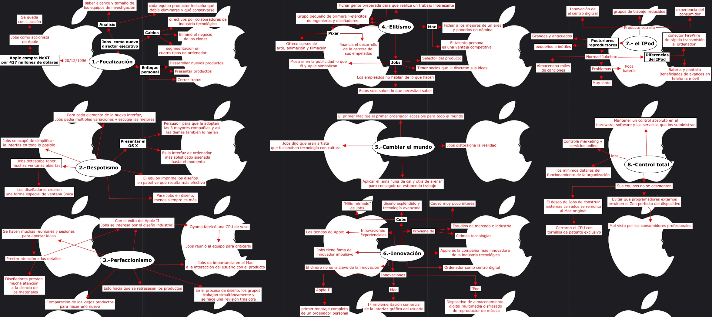 Este Cmap, tiene información relacionada con: CIC-Enlacabezadestivejobs, 1.-Focalización ???? Enfoque personal, 2.-Despotismo ???? Jobs se ocupó de simplificar la interfaz en todo lo posible, 3.-Perfeccionismo ???? Con el éxito del Apple II Jobs se interesa por el diseño industrial, Innovaciones ???? Apple II, Evitar que programadores externos arruinen el Zen perfecto del dispositivo ???? Mal visto por los consumidores profesionales, Normad Jukebox ???? Diferencias del IPod, Con el éxito del Apple II Jobs se interesa por el diseño industrial ???? Oyama fabricó una CPU de yeso, Mac ???? Fichar a los mejores de un área y ponerlos en nómina, 4.-Elitísmo ???? Grupo pequeño de primera >ejércitos de ingenieros y diseñadores, 5.-Cambiar el mundo ???? Aplicar el lema "una de cal y otra de arena" para conseguir un estupendo trabajo, Presentar el OS X ???? Es la interfaz de ordenador más sofisticado siseñada hasta el momento, Jobs como accionista de Apple ???? Se queda con 1 acción, 4.-Elitísmo ???? Fichar gente preparada para que realice un trabajo interesante, 1.-Focalización ???? Jobs como nuevo director ejecutivo, Presentar el OS X ???? Persuadir para que la adopten las 3 mayores compañías y así las demás también lo harían, 6.-Innovación ???? El dinero no es la clave de la innovación, Innovaciones ???? IPod, Jobs como nuevo director ejecutivo ???? Análisis, Cabios ???? Eliminó el negocio de los clones, Jobs ???? Los empleados no hablan de lo que hacen