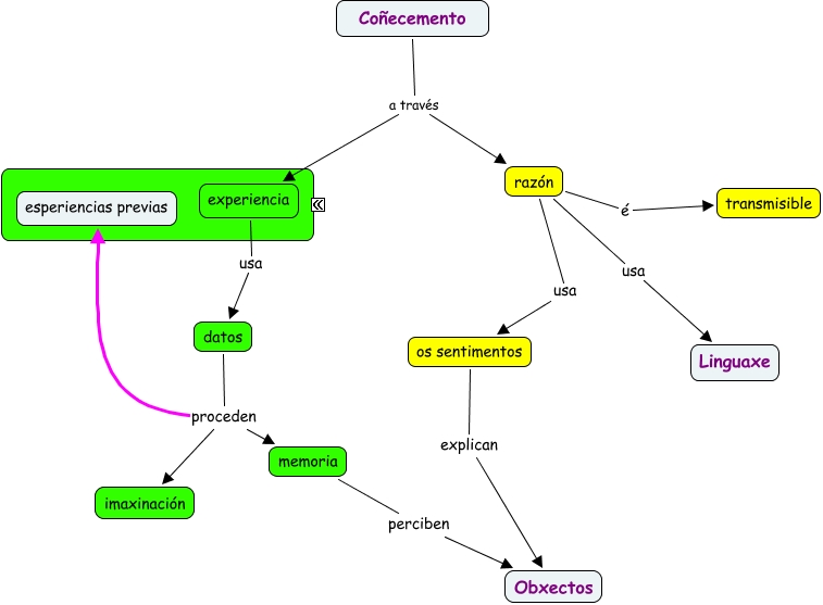 Este Cmap, tiene información relacionada con: Mapa para completar I, razón usa os sentimentos, os sentimentos explican Obxectos, datos proceden imaxinación, razón é transmisible, Coñecemento a través experiencia, razón usa Linguaxe, datos proceden esperiencias previas, Coñecemento a través razón, experiencia usa datos, datos proceden memoria, memoria perciben Obxectos