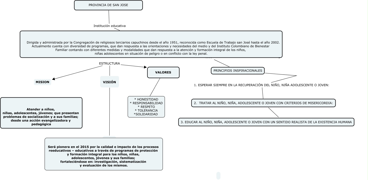 Este Cmap, tiene información relacionada con: TRABAJO MAPA CONCEPTUAL, PROVINCIA DE SAN JOSE Institución educativa Dirigida y administrada por la Congregación de religiosos terciarios capuchinos desde el año 1951, reconocida como Escuela de Trabajo san José hasta el año 2002. Actualmente cuenta con diversidad de programas, que dan respuesta a las orientaciones y necesidades del medio y del Instituto Colombiano de Bienestar Familiar contando con diferentes medidas y modalidades que dan respuesta a la atención y formación integral de los niños, niñas adolescentes en situación de peligro o en conflicto con la ley penal., ???? ESTRUCTURA MISION, PRINCIPIOS INSPIRACIONALES 1. ESPERAR SIEMPRE EN LA RECUPERACIÓN DEL NIÑO, NIÑA ADOLESCENTE O JOVEN: 2. TRATAR AL NIÑO, NIÑA, ADOLESCENTE O JOVEN CON CRITERIOS DE MISERICORDIA:, 2. TRATAR AL NIÑO, NIÑA, ADOLESCENTE O JOVEN CON CRITERIOS DE MISERICORDIA: 3. EDUCAR AL NIÑO, NIÑA, ADOLESCENTE O JOVEN CON UN SENTIDO REALISTA DE LA EXISTENCIA HUMANA, ???? ESTRUCTURA VALORES, PRINCIPIOS INSPIRACIONALES ???? Dirigida y administrada por la Congregación de religiosos terciarios capuchinos desde el año 1951, reconocida como Escuela de Trabajo san José hasta el año 2002. Actualmente cuenta con diversidad de programas, que dan respuesta a las orientaciones y necesidades del medio y del Instituto Colombiano de Bienestar Familiar contando con diferentes medidas y modalidades que dan respuesta a la atención y formación integral de los niños, niñas adolescentes en situación de peligro o en conflicto con la ley penal.