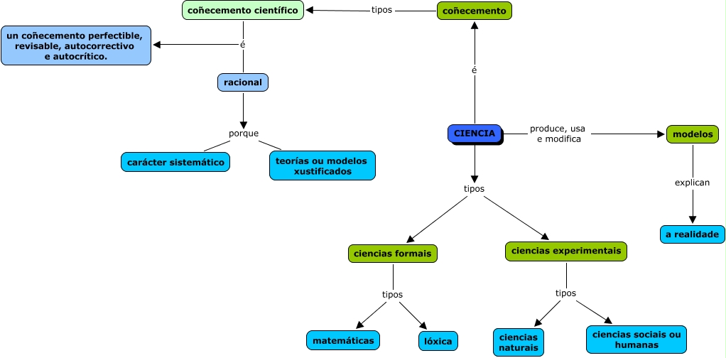 Este Cmap, tiene información relacionada con: ciencia, racional porque carácter sistemático, coñecemento científico é un coñecemento perfectible, revisable, autocorrectivo e autocrítico., coñecemento científico é racional, ciencias formais tipos lóxica, coñecemento tipos coñecemento científico, CIENCIA é coñecemento, CIENCIA produce, usa e modifica modelos, ciencias formais tipos matemáticas, ciencias experimentais tipos ciencias naturais, ciencias experimentais tipos ciencias sociais ou humanas, CIENCIA tipos ciencias experimentais, modelos explican a realidade, racional porque teorías ou modelos xustificados, CIENCIA tipos ciencias formais