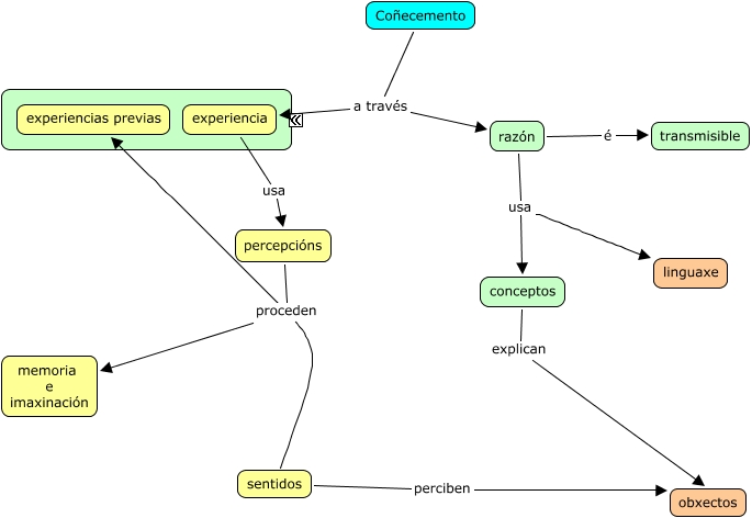 Este Cmap, tiene información relacionada con: Mapa dani, Coñecemento a través razón, percepcións proceden experiencias previas, sentidos perciben obxectos, experiencia usa percepcións, razón usa linguaxe, conceptos explican obxectos, sentidos proceden memoria e imaxinación, razón usa conceptos, sentidos proceden experiencias previas, percepcións proceden memoria e imaxinación, razón é transmisible, Coñecemento a través experiencia