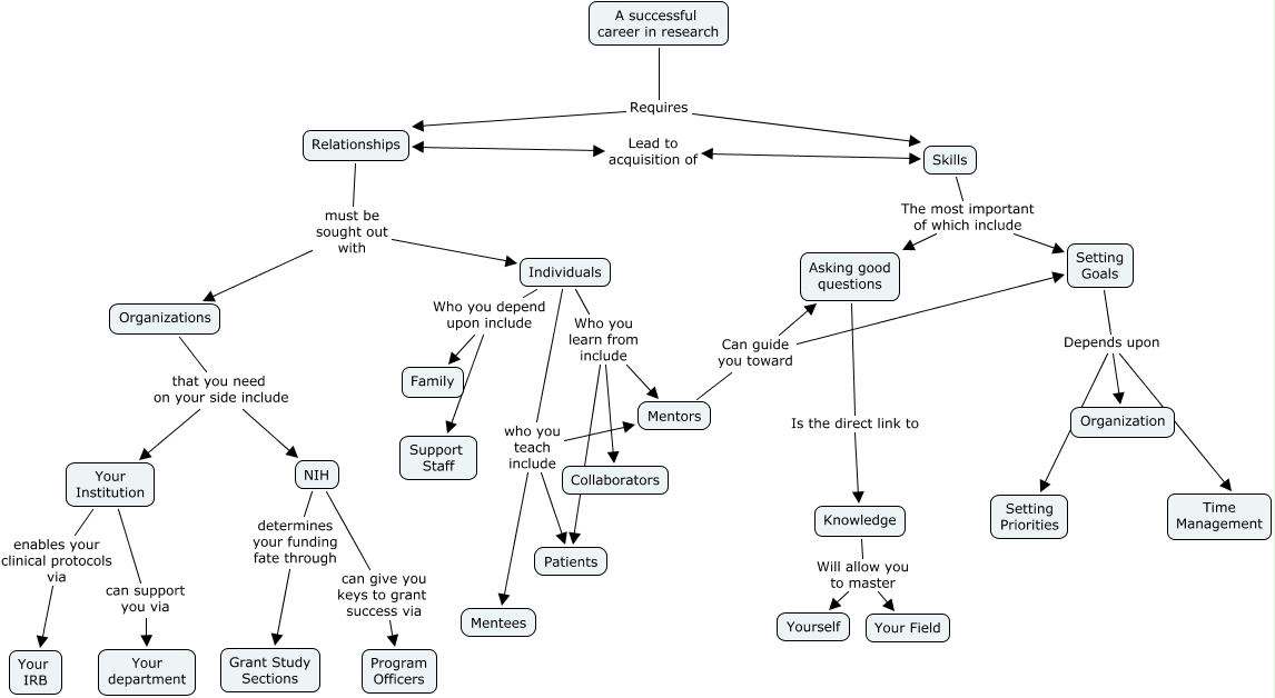 This Concept Map, created with IHMC CmapTools, has information related to: CrankMichelle2, A successful career in research Requires Relationships, Your Institution enables your clinical protocols via Your IRB, Knowledge Will allow you to master Yourself, Asking good questions Is the direct link to Knowledge, Individuals Who you learn from include Patients, Mentors Can guide you toward Asking good questions, Relationships must be sought out with Organizations, Individuals who you teach include Mentors, Individuals Who you depend upon include Support Staff, NIH determines your funding fate through Grant Study Sections, Mentors Can guide you toward Setting Goals, Setting Goals Depends upon Organization, NIH can give you keys to grant success via Program Officers, Individuals Who you learn from include Collaborators, Skills The most important of which include Setting Goals, Relationships Lead to acquisition of Skills, Skills The most important of which include Asking good questions, Individuals who you teach include Mentees, Individuals who you teach include Patients, Setting Goals Depends upon Time Management
