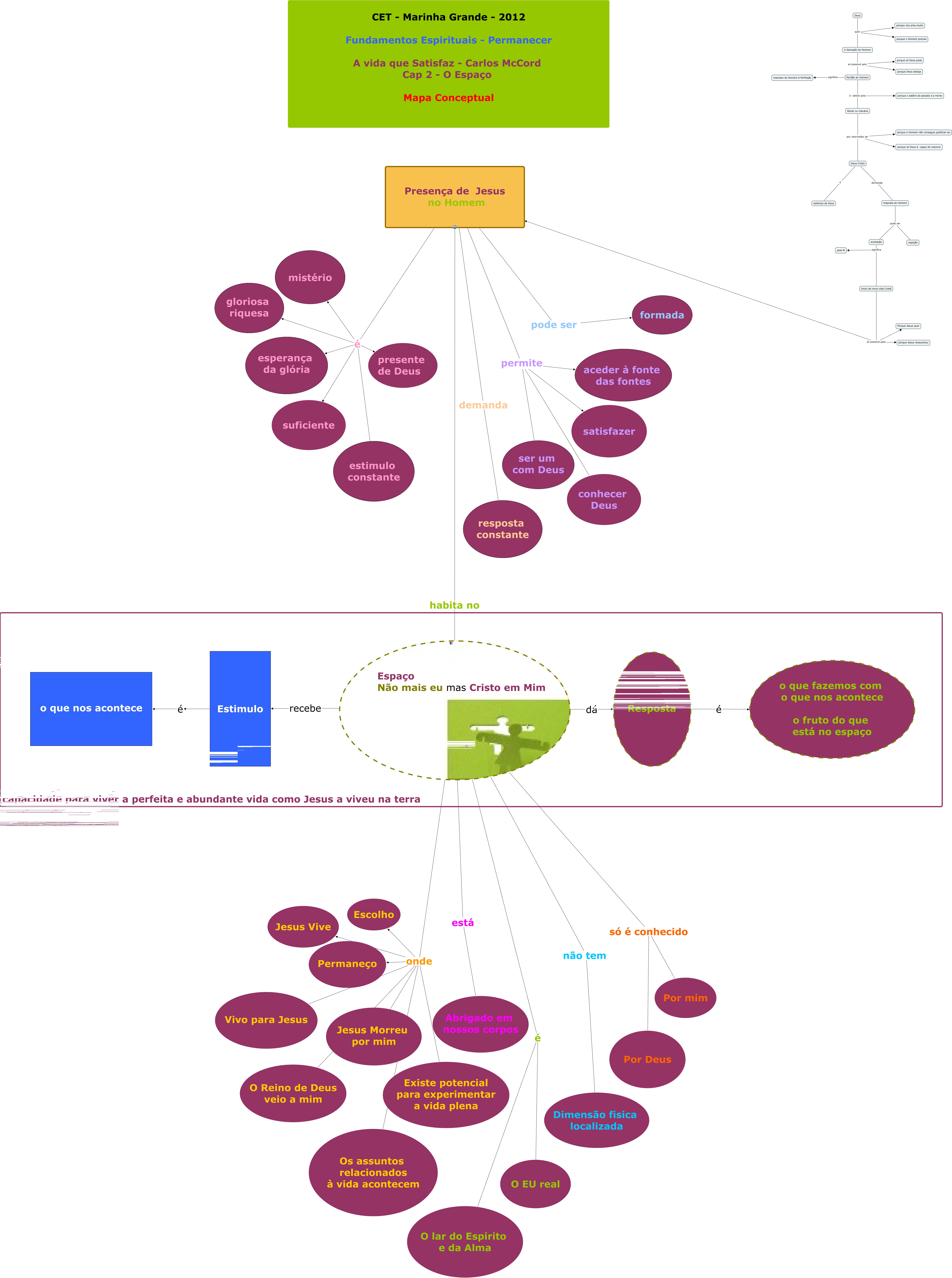 Esse mapa conceitual, produzido no IHMC CmapTools, tem a informação relacionada a: A VIDA QUE SATISFAZ - CAP.02 - O ESPAÇO, Presença de Jesus no Homem pode ser formada, Inicio de nova vida Cristã só possivel pela Porque Jesus quer, Inicio de nova vida Cristã só possivel pela Presença de Jesus no Homem, Perdão ao Homem é obtido pela porque o salário do pecado é a morte, Presença de Jesus no Homem permite conhecer Deus, Presença de Jesus no Homem é estimulo constante, Espaço Não mais eu mas Cristo em Mim só é conhecido Por mim, Espaço Não mais eu mas Cristo em Mim dá Resposta, Resposta é o que fazemos com o que nos acontece o fruto do que está no espaço, aceitação significa Inicio de nova vida Cristã, Presença de Jesus no Homem permite satisfazer, resposta do Homem pode ser aceitação, Presença de Jesus no Homem permite ser um com Deus, A Salvação do Homem só possivel pelo porque só Deus pode, Espaço Não mais eu mas Cristo em Mim está Abrigado em nossos corpos, Deus quer A Salvação do Homem, Espaço Não mais eu mas Cristo em Mim onde Jesus Morreu por mim, Morte no Calvário por intermédio de porque só Deus é capaz de resolver, Espaço Não mais eu mas Cristo em Mim é O EU real, Espaço Não mais eu mas Cristo em Mim onde Existe potencial para experimentar a vida plena