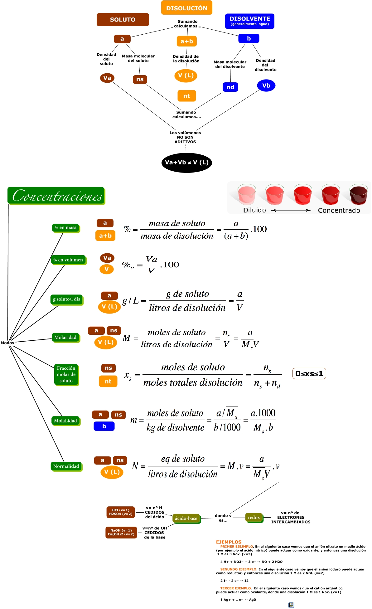 Este Cmap, tiene información relacionada con: Disoluciones todo, b Densidad del disolvente Vb, Concentraciones Modos Fracción molar de soluto, donde v es... redox, donde v es... ácido-base, Concentraciones Modos Normalidad, Concentraciones Modos MolaLidad, a+b Densidad de la disolución V (L), a Masa molecular del soluto ns, a Sumando calculamos... b, ácido-base v=nº de OH CEDIDOS de la base NaOH (v=1) Ca(OH)2 (v=2), Concentraciones Modos Molaridad, Concentraciones Modos % en masa, Concentraciones Modos % en volumen, ns Sumando calculamos.... nt, Va Los volúmenes NO SON ADITIVOS Va+Vb ≠ V (L), Concentraciones Modos g soluto/l dis, redox v= nº de ELECTRONES INTERCAMBIADOS <math xmlns="http://www.w3.org/1998/Math/MathML"> <mrow> <mtext> EJEMPLOS