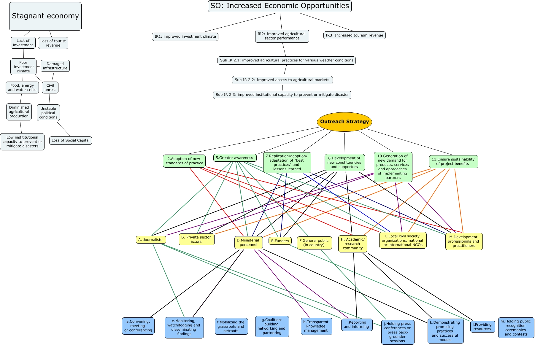Questa Cmap, creata con IHMC CmapTools, contiene informazioni relative a: landscape economy Outreach strategy Kenya econ develop, Poor investment climate Food, energy and water crisis, D.Ministerial personnel e.Monitoring, watchdogging and disseminating findings, Outreach Strategy 11.Ensure sustainability of project benefits, Sub IR 2.1: improved agricultural practices for various weather conditions IR2: Improved agricultural sector performance, Lack of investment Poor investment climate, 2. Adoption of new standards of practice H. Academic/ research community, 10. Generation of new demand for products, services and approaches of implementing partners M. Development professionals and practitioners, D.Ministerial personnel h. Transparent knowledge management, Damaged infrastructure Civil unrest, D.Ministerial personnel i.Reporting and informing, Diminished agricultural production Low instititutional capacity to prevent or mitigate disasters, A. Journalists i.Reporting and informing, IR1: improved investment climate SO: Increased Economic Opportunities, Civil unrest Unstable political conditions, 2. Adoption of new standards of practice M. Development professionals and practitioners, H. Academic/ research community k. Demonstrating promising practices and successful models, Outreach Strategy 8. Development of new constituencies and supporters, Outreach Strategy 2. Adoption of new standards of practice, 7. Replication/adoption/ adaptation of "best practices" and lessons learned E.Funders, Stagnant economy Lack of investment