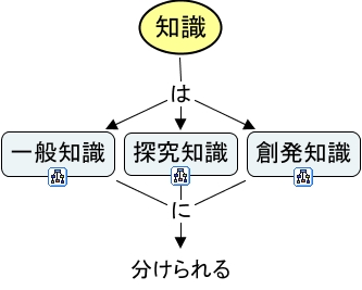 このコンセプトマップに関連する情報: 知識の分類, 探究知識 に 分けられる, 創発知識 に 分けられる, 一般知識 に 分けられる, 知識 は 一般知識, 知識 は 創発知識, 知識 は 探究知識