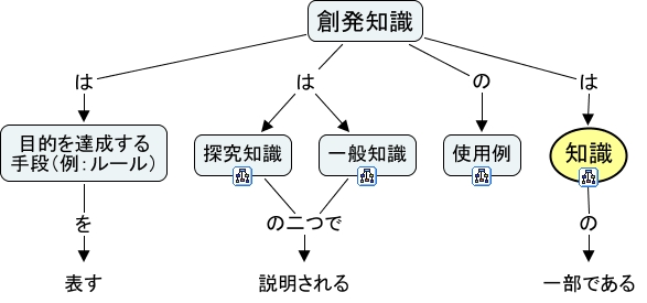 このコンセプトマップに関連する情報: 創発知識について, 創発知識 は 知識, 創発知識 は 目的を達成する 手段(例:ルール), 創発知識 の 使用例, 創発知識 は 探究知識, 知識 の 一部である, 一般知識 の二つで 説明される, 探究知識 の二つで 説明される, 創発知識 は 一般知識, 目的を達成する 手段(例:ルール) を 表す