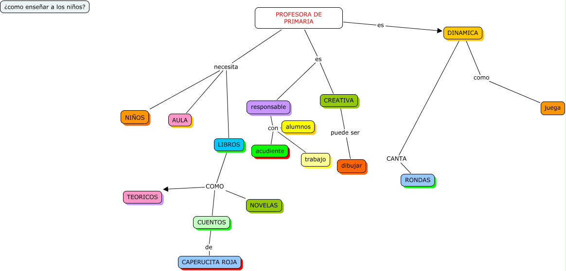 Este Cmap, tiene información relacionada con: profesora Rosa, responsable con acudiente, responsable con trabajo, PROFESORA DE PRIMARIA necesita LIBROS, DINAMICA como juega, PROFESORA DE PRIMARIA necesita AULA, CREATIVA puede ser dibujar, PROFESORA DE PRIMARIA es CREATIVA, LIBROS COMO TEORICOS, CUENTOS de CAPERUCITA ROJA, LIBROS COMO CUENTOS, responsable con alumnos, PROFESORA DE PRIMARIA es DINAMICA, PROFESORA DE PRIMARIA es responsable, DINAMICA CANTA RONDAS, LIBROS COMO NOVELAS, PROFESORA DE PRIMARIA necesita NIÑOS