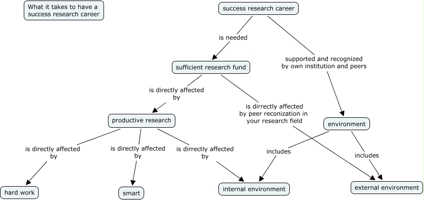 This Concept Map, created with IHMC CmapTools, has information related to: jeffreypumap1, productive research is directly affected by smart, sufficient research fund is directly affected by productive research, success research career is needed sufficient research fund, productive research is dirrectly affected by internal environment, environment includes external environment, productive research is directly affected by hard work, success research career supported and recognized by own institution and peers environment, sufficient research fund is dirrectly affected by peer reconization in your research field external environment, environment includes internal environment