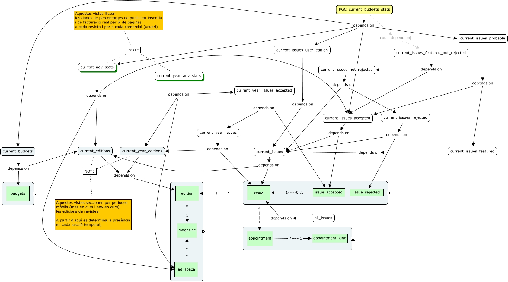 Este Cmap, tiene información relacionada con: Prisma Gestión Comercial (Views), edition * | 1 magazine, current_budgets depends on budgets, ad_space 1 | * magazine, current_issues_not_rejected depends on current_issues, current_issues depends on issue, current_adv_stats depends on current_editions, Aquestes vistes llisten les dades de percentatges de publicitat inserida i de facturacio real per # de pagines a cada revista i per a cada comercial (usuari) NOTE current_year_adv_stats, Aquestes vistes seccionen per períodes mòbils (mes en curs i any en curs) les edicions de revistes. A partir d'aquí es determina la presència en cada secció temporal, NOTE current_year_editions, current_issues_user_edition depends on current_issues, current_issues depends on current_editions, PGC_current_budgets_stats could depend on current_issues_featured_not_rejected, current_year_issues depends on current_year_editions, current_issues_probable depends on current_issues_accepted, issue_accepted 1-----0..1 issue, current_year_adv_stats depends on ad_space, current_issues_accepted depends on current_issues, current_issues_probable depends on current_issues_featured, current_year_adv_stats depends on current_year_editions, PGC_current_budgets_stats depends on current_budgets, current_adv_stats depends on current_issues_accepted
