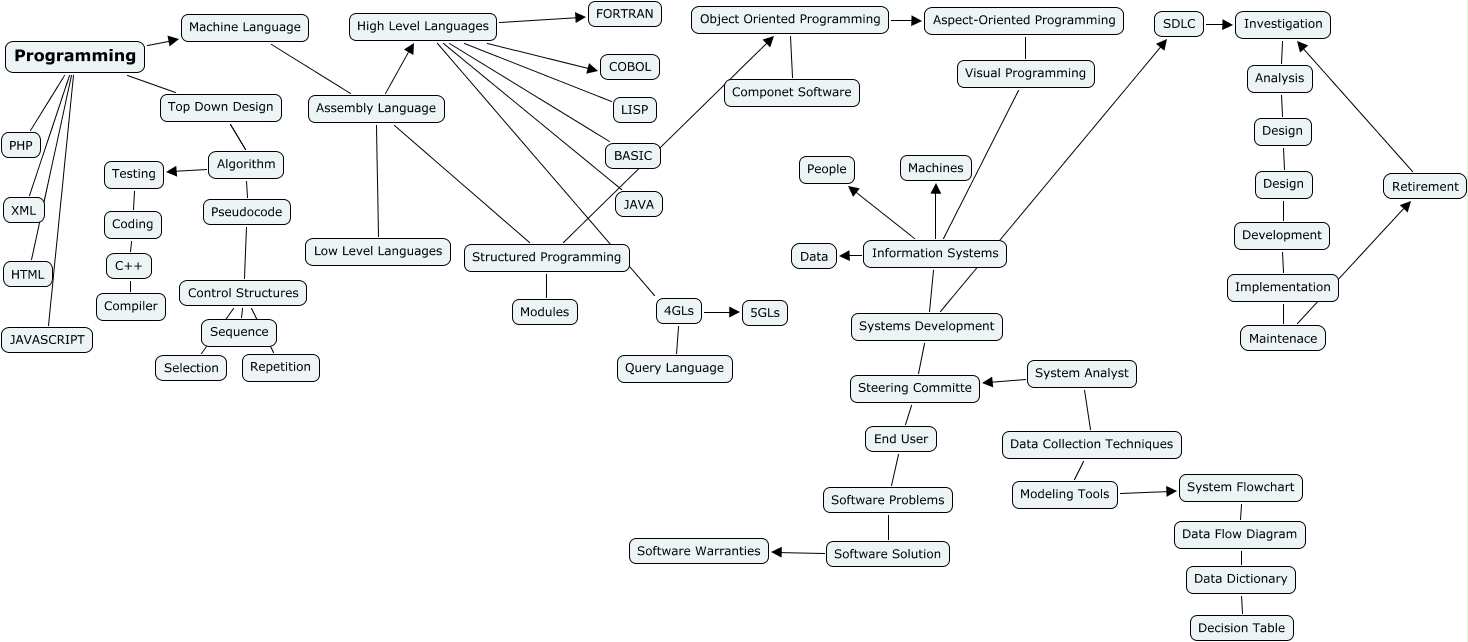 This Concept Map, created with IHMC CmapTools, has information related to: Sanchez, Information Systems People, High Level Languages FORTRAN, Control Structures Sequence, Algorithm Testing, Coding C++, Algorithm Pseudocode, Programming PHP, Maintenace Retirement, Control Structures Repetition, Assembly Language Low Level Languages, C++ Compiler, Analysis Design, Software Problems Software Solution, System Flowchart Data Flow Diagram, Information Systems Data, Structured Programming Modules, Pseudocode Control Structures, SDLC Investigation, High Level Languages LISP, Control Structures Selection