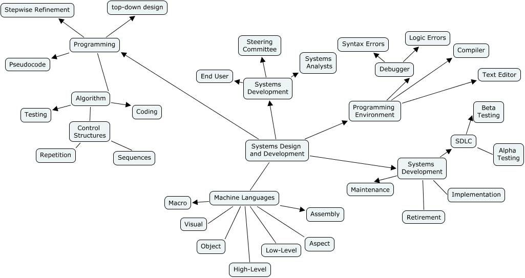 This Concept Map, created with IHMC CmapTools, has information related to: Pendergast, Programming Environment Compiler, Machine Languages High-Level, Systems Design and Development Systems Development, Machine Languages Low-Level, Systems Development Systems Analysts, Algorithm Control Structures, Control Structures Sequences, Programming Environment Debugger, Machine Languages Macro, Systems Development Retirement, Debugger Syntax Errors, Systems Design and Development Machine Languages, Systems Development Implementation, SDLC Alpha Testing, Control Structures Repetition, Systems Design and Development Programming, Systems Development Steering Committee, Programming Pseudocode, Algorithm Coding, SDLC Beta Testing