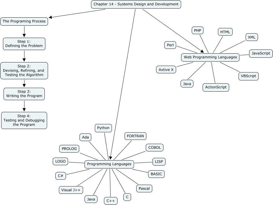 This Concept Map, created with IHMC CmapTools, has information related to: DENNIS, Chapter 14 - Systems Design and Development Programming Languages, Chapter 14 - Systems Design and Development The Programing Process, Programming Languages C, Programming Languages Visual J++, Programming Languages C#, Programming Languages Java, The Programing Process Step 1: Defining the Problem, Web Programming Languages HTML, Chapter 14 - Systems Design and Development Web Programming Languages, Programming Languages BASIC, Programming Languages PROLOG, Programming Languages FORTRAN, Web Programming Languages XML, Web Programming Languages Axtive X, Programming Languages Python, Step 1: Defining the Problem Step 2: Devising, Refining, and Testing the Algorithm, Web Programming Languages Perl, Programming Languages Ada, Web Programming Languages VBScript, Web Programming Languages ActionScript