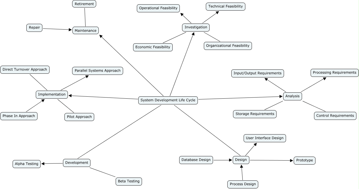 This Concept Map, created with IHMC CmapTools, has information related to: KEITH, Analysis Storage Requirements, System Development Life Cycle Design, Development Beta Testing, Design Prototype, Process Design Design, Development Alpha Testing, Analysis Control Requirements, System Development Life Cycle Development, Retirement Maintenance, Phase In Approach Implementation, Analysis Input/Output Requirements, Investigation Technical Feasibility, System Development Life Cycle Implementation, Analysis Processing Requirements, Implementation Pilot Approach, Direct Turnover Approach Implementation, Database Design Design, System Development Life Cycle Analysis, Investigation Operational Feasibility, Investigation Economic Feasibility