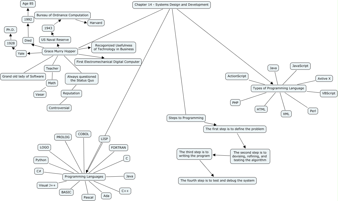 This Concept Map, created with IHMC CmapTools, has information related to: ERIC, Programming Languages PROLOG, US Naval Reserve 1943, Grace Murry Hopper First Electromechanical Digital Computer, Programming Languages C, Types of Programming Language Axtive X, The second step is to devising, refining, and testing the algorithm The third step is to writing the program, Grace Murry Hopper US Naval Reserve, Types of Programming Language ActionScript, 1943 Bureau of Ordnance Computation, Programming Languages LOGO, Types of Programming Language JavaScript, Grace Murry Hopper Yale, Programming Languages FORTRAN, Programming Languages COBOL, Types of Programming Language PHP, Types of Programming Language Java, Chapter 14 - Systems Design and Development Programming Languages, Programming Languages Python, Grace Murry Hopper Grand old lady of Software, Chapter 14 - Systems Design and Development Steps to Programming