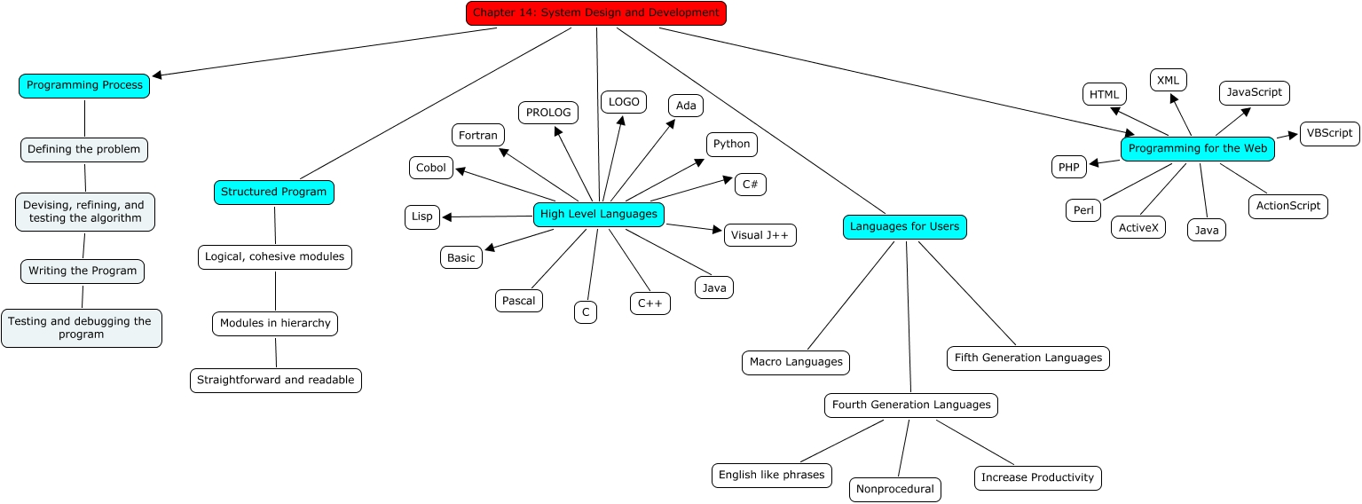 This Concept Map, created with IHMC CmapTools, has information related to: FIACHRA, Chapter 14: System Design and Development Structured Program, Fourth Generation Languages Nonprocedural, Structured Program Logical, cohesive modules, Logical, cohesive modules Modules in hierarchy, High Level Languages Fortran, Fourth Generation Languages Increase Productivity, Chapter 14: System Design and Development Languages for Users, Chapter 14: System Design and Development High Level Languages, High Level Languages Ada, Chapter 14: System Design and Development Programming for the Web, Chapter 14: System Design and Development Programming Process, High Level Languages PROLOG, Fourth Generation Languages English like phrases, Programming for the Web Java, High Level Languages Basic, High Level Languages Java, High Level Languages C#, High Level Languages Visual J++, Languages for Users Macro Languages, Modules in hierarchy Straightforward and readable