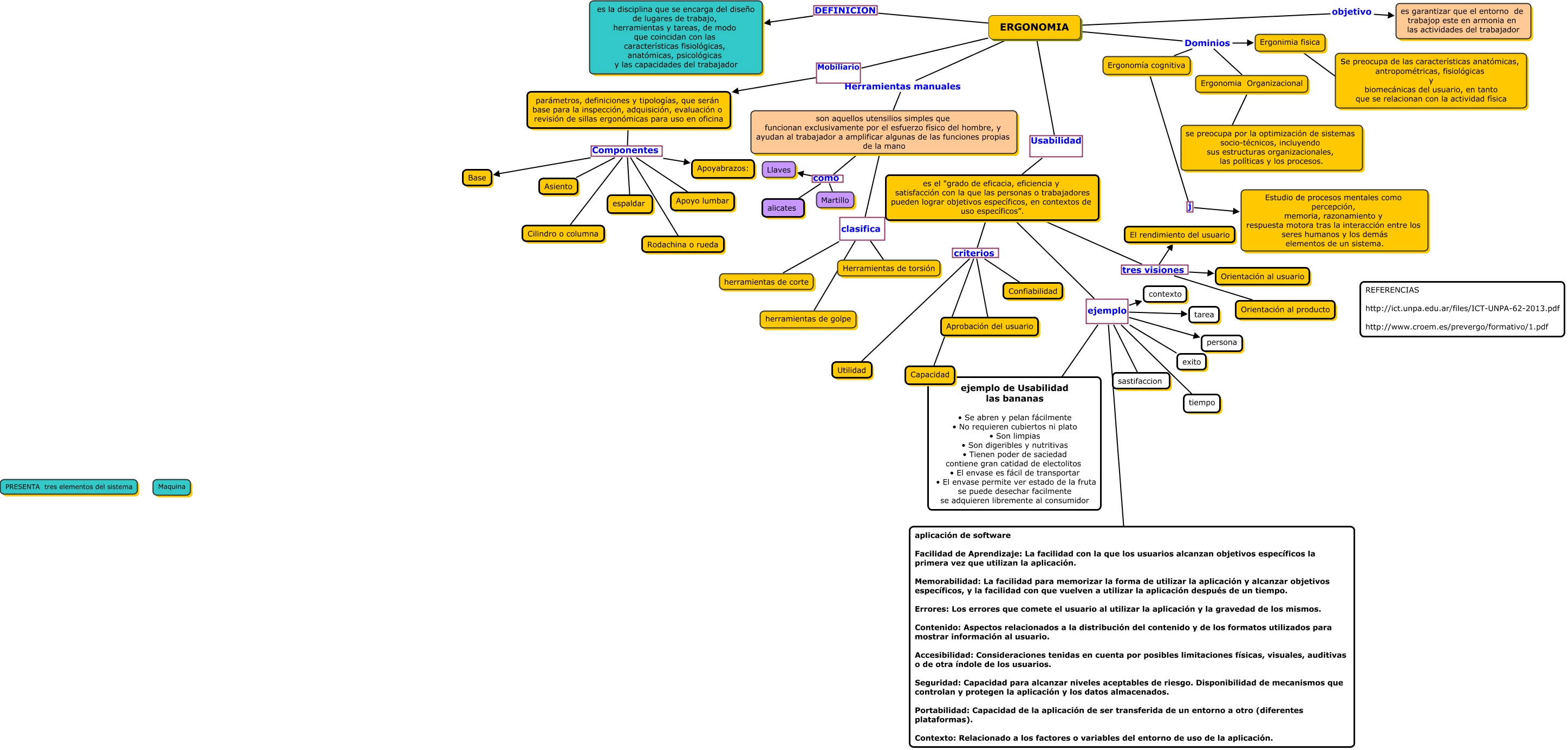 Este Cmap, tiene información relacionada con: NIÑEZ TEMPRANA, es el "grado de eficacia, eficiencia y satisfacción con la que las personas o trabajadores pueden lograr objetivos específicos, en contextos de uso específicos”. ejemplo persona, parámetros, definiciones y tipologías, que serán base para la inspección, adquisición, evaluación o revisión de sillas ergonómicas para uso en oficina Componentes Apoyo lumbar, parámetros, definiciones y tipologías, que serán base para la inspección, adquisición, evaluación o revisión de sillas ergonómicas para uso en oficina Componentes espaldar, parámetros, definiciones y tipologías, que serán base para la inspección, adquisición, evaluación o revisión de sillas ergonómicas para uso en oficina Componentes Asiento, es el "grado de eficacia, eficiencia y satisfacción con la que las personas o trabajadores pueden lograr objetivos específicos, en contextos de uso específicos”. tres visiones El rendimiento del usuario, ERGONOMIA Usabilidad es el "grado de eficacia, eficiencia y satisfacción con la que las personas o trabajadores pueden lograr objetivos específicos, en contextos de uso específicos”., parámetros, definiciones y tipologías, que serán base para la inspección, adquisición, evaluación o revisión de sillas ergonómicas para uso en oficina Componentes Apoyabrazos:, parámetros, definiciones y tipologías, que serán base para la inspección, adquisición, evaluación o revisión de sillas ergonómicas para uso en oficina Componentes Base, son aquellos utensilios simples que funcionan exclusivamente por el esfuerzo físico del hombre, y ayudan al trabajador a amplificar algunas de las funciones propias de la mano clasifica herramientas de corte, ERGONOMIA DEFINICION es la disciplina que se encarga del diseño de lugares de trabajo, herramientas y tareas, de modo que coincidan con las características fisiológicas, anatómicas, psicológicas y las capacidades del trabajador, son aquellos utensilios simples que funcionan exclusivamente por el esfuerzo físico del hombre, y ayudan al trabajador a amplificar algunas de las funciones propias de la mano como alicates, es el "grado de eficacia, eficiencia y satisfacción con la que las personas o trabajadores pueden lograr objetivos específicos, en contextos de uso específicos”. ejemplo tiempo, es el "grado de eficacia, eficiencia y satisfacción con la que las personas o trabajadores pueden lograr objetivos específicos, en contextos de uso específicos”. tres visiones Orientación al usuario, es el "grado de eficacia, eficiencia y satisfacción con la que las personas o trabajadores pueden lograr objetivos específicos, en contextos de uso específicos”. tres visiones Orientación al producto, son aquellos utensilios simples que funcionan exclusivamente por el esfuerzo físico del hombre, y ayudan al trabajador a amplificar algunas de las funciones propias de la mano clasifica herramientas de golpe, ERGONOMIA Dominios Ergonomia Organizacional, son aquellos utensilios simples que funcionan exclusivamente por el esfuerzo físico del hombre, y ayudan al trabajador a amplificar algunas de las funciones propias de la mano como Llaves, ERGONOMIA Dominios Ergonomía cognitiva, es el "grado de eficacia, eficiencia y satisfacción con la que las personas o trabajadores pueden lograr objetivos específicos, en contextos de uso específicos”. ejemplo aplicación de software Facilidad de Aprendizaje: La facilidad con la que los usuarios alcanzan objetivos específicos la primera vez que utilizan la aplicación. Memorabilidad: La facilidad para memorizar la forma de utilizar la aplicación y alcanzar objetivos específicos, y la facilidad con que vuelven a utilizar la aplicación después de un tiempo. Errores: Los errores que comete el usuario al utilizar la aplicación y la gravedad de los mismos. Contenido: Aspectos relacionados a la distribución del contenido y de los formatos utilizados para mostrar información al usuario. Accesibilidad: Consideraciones tenidas en cuenta por posibles limitaciones físicas, visuales, auditivas o de otra índole de los usuarios. Seguridad: Capacidad para alcanzar niveles aceptables de riesgo. Disponibilidad de mecanismos que controlan y protegen la aplicación y los datos almacenados. Portabilidad: Capacidad de la aplicación de ser transferida de un entorno a otro (diferentes plataformas). Contexto: Relacionado a los factores o variables del entorno de uso de la aplicación., es el "grado de eficacia, eficiencia y satisfacción con la que las personas o trabajadores pueden lograr objetivos específicos, en contextos de uso específicos”. ejemplo ejemplo de Usabilidad las bananas • Se abren y pelan fácilmente • No requieren cubiertos ni plato • Son limpias • Son digeribles y nutritivas • Tienen poder de saciedad contiene gran catidad de electolitos • El envase es fácil de transportar • El envase permite ver estado de la fruta se puede desechar facilmente se adquieren libremente al consumidor