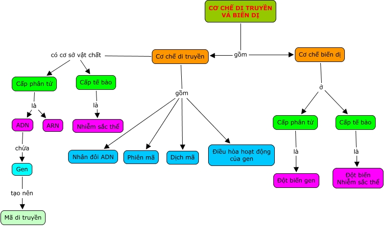 This Concept Map, created with IHMC CmapTools, has information related to: bđkq chương 1, Cơ chế biến dị ở Cấp tế bào, Cơ chế di truyền gồm Phiên mã, Cơ chế biến dị ở Cấp phân tử, Cấp tế bào là Nhiễm sắc thể, Cơ chế di truyền gồm Nhân đôi ADN, Cấp tế bào là Đột biến Nhiễm sắc thể, CƠ CHẾ DI TRUYỀN VÀ BIẾN DỊ gồm Cơ chế biến dị, Cấp phân tử là ARN, ADN chứa Gen, Cơ chế di truyền có cơ sở vật chất Cấp phân tử, Cơ chế di truyền có cơ sở vật chất Cấp tế bào, Cơ chế di truyền gồm Dịch mã, Gen tạo nên Mã di truyền, CƠ CHẾ DI TRUYỀN VÀ BIẾN DỊ gồm Cơ chế di truyền, Cơ chế di truyền gồm Điều hòa hoạt động của gen, Cấp phân tử là ADN, Cấp phân tử là Đột biến gen