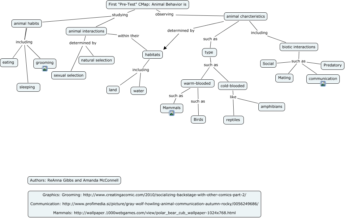 This Concept Map, created with IHMC CmapTools, has information related to: Gibbs MCconnell What is Animal Behavior - first, First "Pre-Test" CMap: Animal Behavior is observing animal charcteristics, animal charcteristics such as type, habitats including land, biotic interactions such as communication, biotic interactions such as Social, type such as cold-blooded, animal charcteristics determined by habitats, animal interactions determined by sexual selection, habitats including water, warm-blooded such as Mammals, animal habits including sleeping, animal habits including grooming, First "Pre-Test" CMap: Animal Behavior is studying animal habits, First "Pre-Test" CMap: Animal Behavior is studying animal interactions, biotic interactions such as Mating, warm-blooded such as Birds, animal habits including eating, cold-blooded like amphibians, animal charcteristics including biotic interactions, biotic interactions such as Predatory