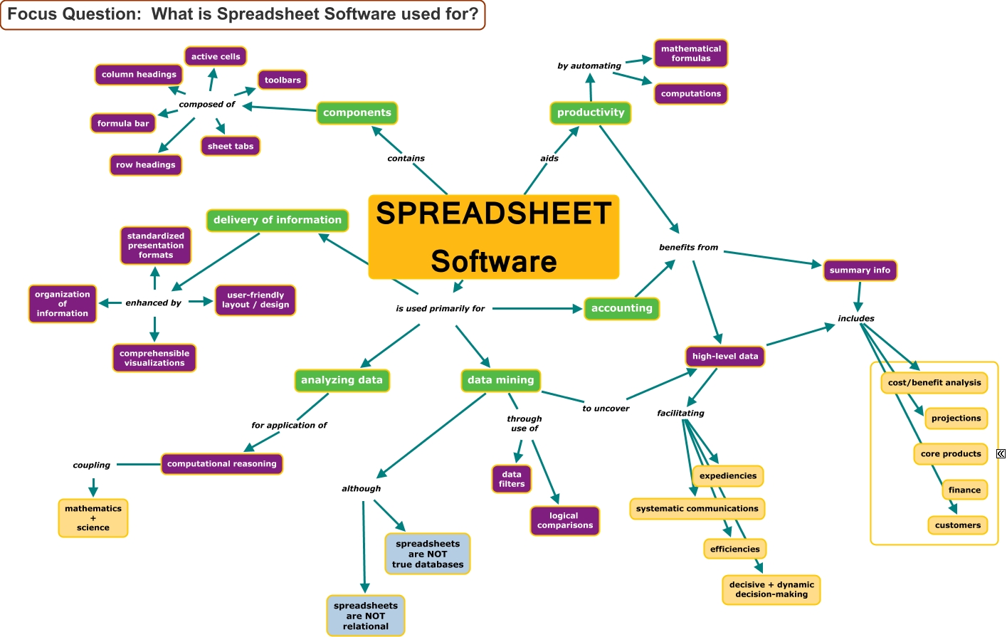 This Concept Map, created with IHMC CmapTools, has information related to: 04_four, data mining through use of data filters, SPREADSHEET Software is used primarily for delivery of information, computational reasoning coupling mathematics + science, SPREADSHEET Software is used primarily for analyzing data, high-level data facilitating decisive + dynamic decision-making, SPREADSHEET Software is used primarily for accounting, accounting benefits from summary info, components composed of formula bar, SPREADSHEET Software is used primarily for data mining, productivity benefits from summary info, high-level data facilitating efficiencies, data mining through use of logical comparisons, productivity by automating mathematical formulas, components composed of sheet tabs, productivity benefits from high-level data, high-level data facilitating expediencies, SPREADSHEET Software aids productivity, data mining to uncover high-level data, data mining although spreadsheets are NOT true databases, high-level data includes cost/benefit analysis