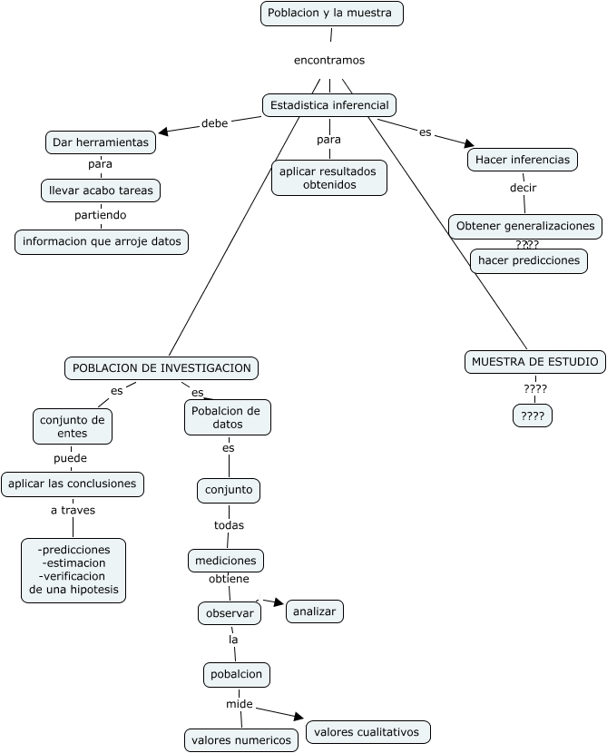 Este Cmap, tiene información relacionada con: KATA, pobalcion mide valores numericos, llevar acabo tareas partiendo informacion que arroje datos, Poblacion y la muestra encontramos MUESTRA DE ESTUDIO, POBLACION DE INVESTIGACION es conjunto de entes, Poblacion y la muestra encontramos POBLACION DE INVESTIGACION, Estadistica inferencial es Hacer inferencias, aplicar las conclusiones a traves -predicciones -estimacion -verificacion de una hipotesis, conjunto de entes puede aplicar las conclusiones, Poblacion y la muestra encontramos Estadistica inferencial, mediciones obtiene observar, Hacer inferencias decir Obtener generalizaciones, Pobalcion de datos es conjunto, hacer predicciones ???? Obtener generalizaciones, observar la pobalcion, Estadistica inferencial debe Dar herramientas, observar analizar, Estadistica inferencial encontramos MUESTRA DE ESTUDIO, Estadistica inferencial encontramos POBLACION DE INVESTIGACION, conjunto todas mediciones, Dar herramientas para llevar acabo tareas