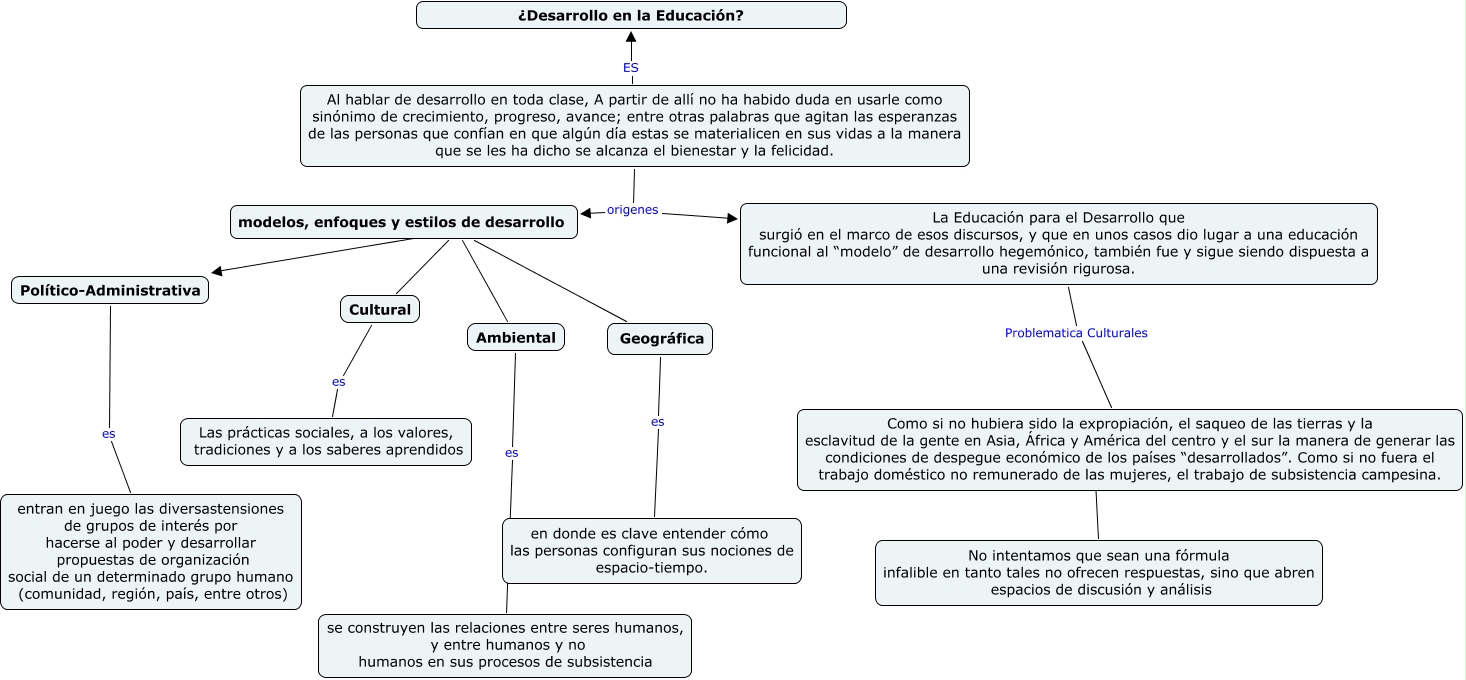 Este Cmap, tiene información relacionada con: nuevo, Al hablar de desarrollo en toda clase, A partir de allí no ha habido duda en usarle como sinónimo de crecimiento, progreso, avance; entre otras palabras que agitan las esperanzas de las personas que confían en que algún día estas se materialicen en sus vidas a la manera que se les ha dicho se alcanza el bienestar y la felicidad. origenes La Educación para el Desarrollo que surgió en el marco de esos discursos, y que en unos casos dio lugar a una educación funcional al “modelo” de desarrollo hegemónico, también fue y sigue siendo dispuesta a una revisión rigurosa., Ambiental es se construyen las relaciones entre seres humanos, y entre humanos y no humanos en sus procesos de subsistencia, Al hablar de desarrollo en toda clase, A partir de allí no ha habido duda en usarle como sinónimo de crecimiento, progreso, avance; entre otras palabras que agitan las esperanzas de las personas que confían en que algún día estas se materialicen en sus vidas a la manera que se les ha dicho se alcanza el bienestar y la felicidad. ES ¿Desarrollo en la Educación?, Cultural es Las prácticas sociales, a los valores, tradiciones y a los saberes aprendidos, modelos, enfoques y estilos de desarrollo principios Cultural, Político-Administrativa es entran en juego las diversastensiones de grupos de interés por hacerse al poder y desarrollar propuestas de organización social de un determinado grupo humano (comunidad, región, país, entre otros), Como si no hubiera sido la expropiación, el saqueo de las tierras y la esclavitud de la gente en Asia, África y América del centro y el sur la manera de generar las condiciones de despegue económico de los países “desarrollados”. Como si no fuera el trabajo doméstico no remunerado de las mujeres, el trabajo de subsistencia campesina. ???? No intentamos que sean una fórmula infalible en tanto tales no ofrecen respuestas, sino que abren espacios de discusión y análisis, modelos, enfoques y estilos de desarrollo principios Geográfica, modelos, enfoques y estilos de desarrollo principios Político-Administrativa, La Educación para el Desarrollo que surgió en el marco de esos discursos, y que en unos casos dio lugar a una educación funcional al “modelo” de desarrollo hegemónico, también fue y sigue siendo dispuesta a una revisión rigurosa. Problematica Culturales Como si no hubiera sido la expropiación, el saqueo de las tierras y la esclavitud de la gente en Asia, África y América del centro y el sur la manera de generar las condiciones de despegue económico de los países “desarrollados”. Como si no fuera el trabajo doméstico no remunerado de las mujeres, el trabajo de subsistencia campesina., Geográfica es en donde es clave entender cómo las personas configuran sus nociones de espacio-tiempo., modelos, enfoques y estilos de desarrollo principios Ambiental, Al hablar de desarrollo en toda clase, A partir de allí no ha habido duda en usarle como sinónimo de crecimiento, progreso, avance; entre otras palabras que agitan las esperanzas de las personas que confían en que algún día estas se materialicen en sus vidas a la manera que se les ha dicho se alcanza el bienestar y la felicidad. origenes modelos, enfoques y estilos de desarrollo