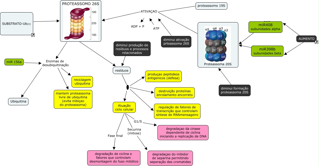 Esse mapa conceitual, produzido no IHMC CmapTools, tem a informação relacionada a: aumento miR408 e miR398b, miR 156a Enzimas de desubiquitinação Ubiquitina, diminui ativação prteassoma 26S ATIVAÇAO PROTEASSOMO 26S, ATP ATIVAÇAO PROTEASSOMO 26S, diminui ativação prteassoma 26S ATIVAÇAO ADP + P, diminui produção de resíduos e processos relacionados ???? resíduos, Atuação ciclo celular G1/S degradaçao da cinase dependente de ciclina iniciando a replicação de DNA, proteassomo 19S ATIVAÇAO ADP + P, resíduos produçao pepitideos antigenicos (defesa), resíduos regulação de fatores de transcrição que controlam síntese de RNAmensageiro, miR398b subunidades beta ???? Proteassoma 20S, miR 156a Enzimas de desubiquitinação mantem proteassoma livre de ubiquitina (evita inibiçao do proteassoma), PROTEASSOMO 26S ???? resíduos, SUBSTRATO-Ub(n) ???? PROTEASSOMO 26S, PROTEASSOMO 26S Enzimas de desubiquitinação mantem proteassoma livre de ubiquitina (evita inibiçao do proteassoma), AUMENTO ???? miR398b subunidades beta, proteassomo 19S ATIVAÇAO PROTEASSOMO 26S, Atuação ciclo celular Fase final degradação de ciclina e fatores que controlam desmontagem do fuso mitótico, Proteassoma 20S ATIVAÇAO ADP + P, miR 156a Enzimas de desubiquitinação reciclagem ubiquitina, PROTEASSOMO 26S Enzimas de desubiquitinação Ubiquitina