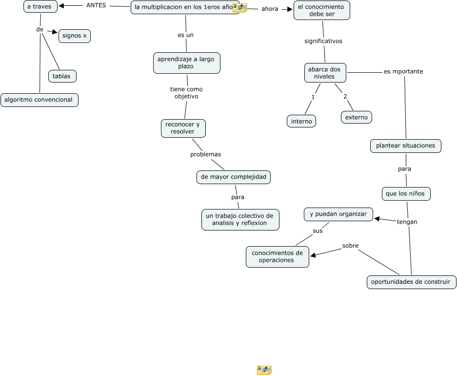 Este Cmap, tiene información relacionada con: Cmap euge y debo, abarca dos niveles es mportante plantear situaciones, a traves de algoritmo convencional, a traves de tablas, la multiplicacion en los 1eros años ahora el conocimiento debe ser, la multiplicacion en los 1eros años es un aprendizaje a largo plazo, que los niños tengan oportunidades de construir, reconocer y resolver problemas de mayor complejidad, y puedan organizar sus conocimientos de operaciones, plantear situaciones para que los niños, de mayor complejidad para un trabajo colectivo de analisis y reflexion, aprendizaje a largo plazo tiene como objetivo reconocer y resolver, oportunidades de construir sobre conocimientos de operaciones, abarca dos niveles 1 interno, a traves de signos x, el conocimiento debe ser significativos abarca dos niveles, la multiplicacion en los 1eros años ANTES a traves, que los niños tengan y puedan organizar, abarca dos niveles 2 externo
