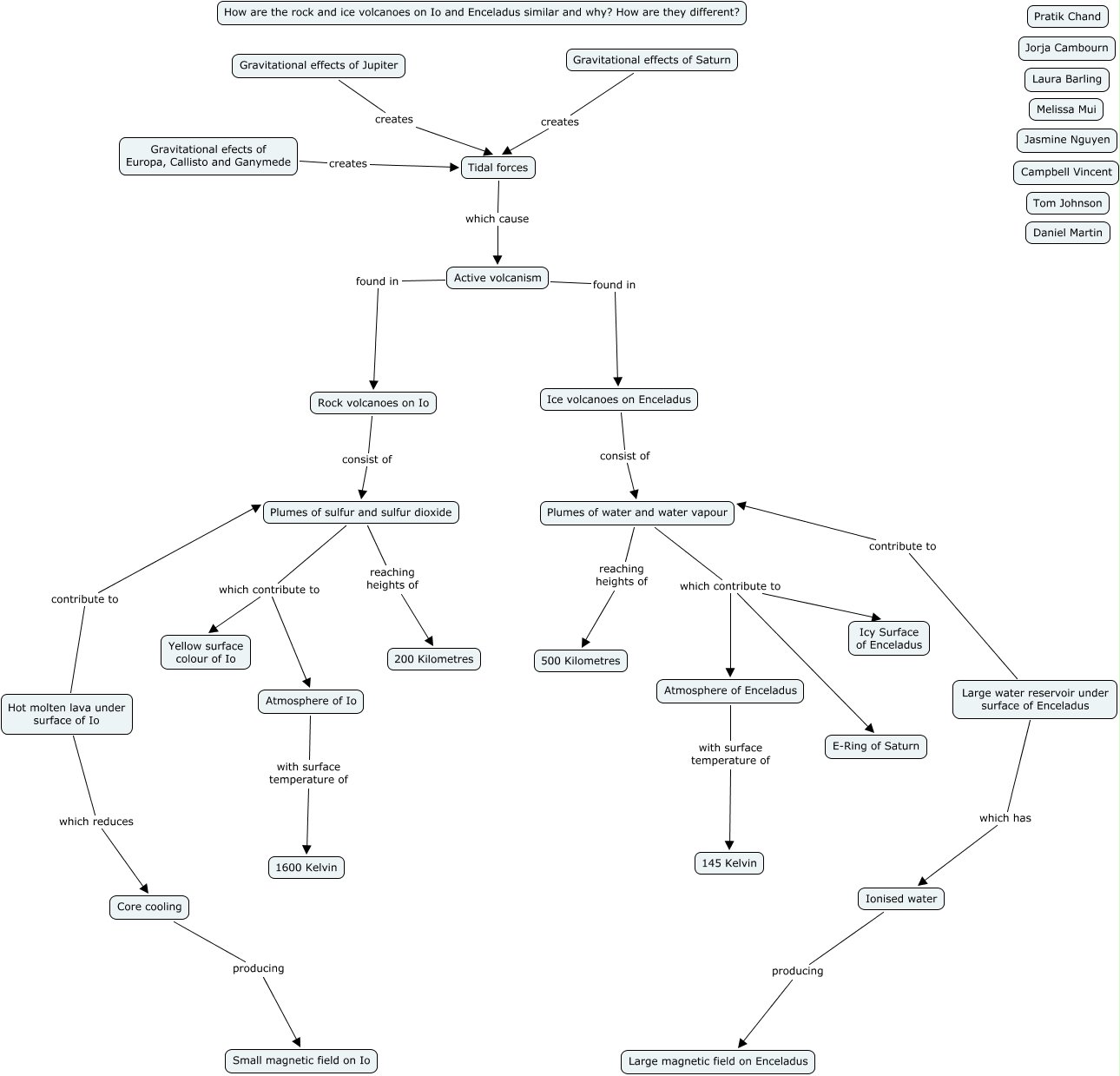 This Concept Map, created with IHMC CmapTools, has information related to: Group R - Pratik, Laura, Jorja, Thomas, Large water reservoir under surface of Enceladus which has Ionised water, Hot molten lava under surface of Io which reduces Core cooling, Gravitational effects of Saturn creates Tidal forces, Gravitational efects of Europa, Callisto and Ganymede creates Tidal forces, Large water reservoir under surface of Enceladus contribute to Plumes of water and water vapour, Plumes of sulfur and sulfur dioxide which contribute to Atmosphere of Io, Plumes of sulfur and sulfur dioxide which contribute to Yellow surface colour of Io, Active volcanism found in Rock volcanoes on Io, Rock volcanoes on Io consist of Plumes of sulfur and sulfur dioxide, Plumes of water and water vapour which contribute to E-Ring of Saturn, Plumes of sulfur and sulfur dioxide reaching heights of 200 Kilometres, Ionised water producing Large magnetic field on Enceladus, Gravitational effects of Jupiter creates Tidal forces, Tidal forces which cause Active volcanism, Plumes of water and water vapour which contribute to Icy Surface of Enceladus, Hot molten lava under surface of Io contribute to Plumes of sulfur and sulfur dioxide, Plumes of water and water vapour reaching heights of 500 Kilometres, Active volcanism found in Ice volcanoes on Enceladus, Core cooling producing Small magnetic field on Io, Plumes of water and water vapour which contribute to Atmosphere of Enceladus