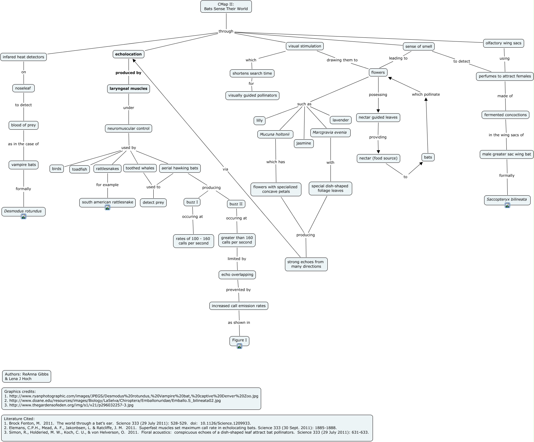 This Concept Map, created with IHMC CmapTools, has information related to: Gibbs Hoch Bat Sensory, shortens search time for visually guided pollinators, male greater sac wing bat formally Saccopteryx bilineata, blood of prey as in the case of vampire bats, noseleaf to detect blood of prey, flowers such as jasmine, fermented concoctions in the wing sacs of male greater sac wing bat, special dish-shaped foliage leaves producing strong echoes from many directions, laryngeal muscles under neuromuscular control, flowers such as lavender, neuromuscular control used by birds, flowers with specialized concave petals producing strong echoes from many directions, toothed whales used to detect prey, rattlesnakes for example south american rattlesnake, aerial hawking bats producing buzz I, neuromuscular control used by rattlesnakes, Marcgravia evenia with special dish-shaped foliage leaves, buzz I occuring at rates of 100 - 160 calls per second, greater than 160 calls per second limited by echo overlapping, CMap II: Bats Sense Their World through sense of smell, nectar guided leaves providing nectar (food source)
