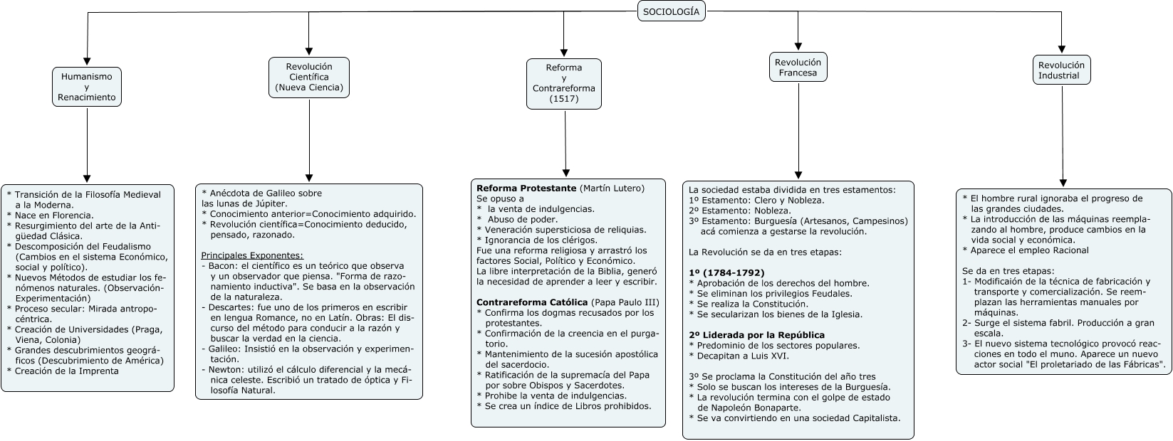 Este Cmap, tiene información relacionada con: Sociología, SOCIOLOGÍA Humanismo y Renacimiento, SOCIOLOGÍA Reforma y Contrareforma (1517), SOCIOLOGÍA Revolución Francesa, Revolución Francesa La sociedad estaba dividida en tres estamentos: 1º Estamento: Clero y Nobleza. 2º Estamento: Nobleza. 3º Estamento: Burguesía (Artesanos, Campesinos) acá comienza a gestarse la revolución. La Revolución se da en tres etapas: 1º (1784-1792) * Aprobación de los derechos del hombre. * Se eliminan los privilegios Feudales. * Se realiza la Constitución. * Se secularizan los bienes de la Iglesia. 2º Liderada por la República * Predominio de los sectores populares. * Decapitan a Luis XVI. 3º Se proclama la Constitución del año tres * Solo se buscan los intereses de la Burguesía. * La revolución termina con el golpe de estado de Napoleón Bonaparte. * Se va convirtiendo en una sociedad Capitalista., Humanismo y Renacimiento * Transición de la Filosofía Medieval a la Moderna. * Nace en Florencia. * Resurgimiento del arte de la Anti- güedad Clásica. * Descomposición del Feudalismo (Cambios en el sistema Económico, social y político). * Nuevos Métodos de estudiar los fe- nómenos naturales. (Observación- Experimentación) * Proceso secular: Mirada antropo- céntrica. * Creación de Universidades (Praga, Viena, Colonia) * Grandes descubrimientos geográ- ficos (Descubrimiento de América) * Creación de la Imprenta, Reforma y Contrareforma (1517) Reforma Protestante (Martín Lutero) Se opuso a * la venta de indulgencias. * Abuso de poder. * Veneración supersticiosa de reliquias. * Ignorancia de los clérigos. Fue una reforma religiosa y arrastró los factores Social, Político y Económico. La libre interpretación de la Biblia, generó la necesidad de aprender a leer y escribir. Contrareforma Católica (Papa Paulo III) * Confirma los dogmas recusados por los protestantes. * Confirmación de la creencia en el purga- torio. * Mantenimiento de la sucesión apostólica del sacerdocio. * Ratificación de la supremacía del Papa por sobre Obispos y Sacerdotes. * Prohibe la venta de indulgencias. * Se crea un índice de Libros prohibidos., Revolución Científica (Nueva Ciencia) * Anécdota de Galileo sobre las lunas de Júpiter. * Conocimiento anterior=Conocimiento adquirido. * Revolución científica=Conocimiento deducido, pensado, razonado. Principales Exponentes: - Bacon: el científico es un teórico que observa y un observador que piensa. "Forma de razo- namiento inductiva". Se basa en la observación de la naturaleza. - Descartes: fue uno de los primeros en escribir en lengua Romance, no en Latín. Obras: El dis- curso del método para conducir a la razón y buscar la verdad en la ciencia. - Galileo: Insistió en la observación y experimen- tación. - Newton: utilizó el cálculo diferencial y la mecá- nica celeste. Escribió un tratado de óptica y Fi- losofía Natural., SOCIOLOGÍA Revolución Científica (Nueva Ciencia), SOCIOLOGÍA Revolución Industrial, Revolución Industrial * El hombre rural ignoraba el progreso de las grandes ciudades. * La introducción de las máquinas reempla- zando al hombre, produce cambios en la vida social y económica. * Aparece el empleo Racional Se da en tres etapas: 1- Modificaión de la técnica de fabricación y transporte y comercialización. Se reem- plazan las herramientas manuales por máquinas. 2- Surge el sistema fabril. Producción a gran escala. 3- El nuevo sistema tecnológico provocó reac- ciones en todo el muno. Aparece un nuevo actor social "El proletariado de las Fábricas".