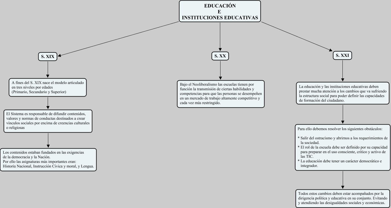 Este Cmap, tiene información relacionada con: Educación e Instituciones Educativas, S. XX Bajo el Neoliberalismo las escuelas tienen por función la transmisión de ciertas habilidades y competencias para que las personas se desempeñen en un mercado de trabajo altamente competitivo y cada vez más restringido., EDUCACIÓN E INSTITUCIONES EDUCATIVAS S. XX, S. XXI La educación y las instituciones educativas deben prestar mucha atención a los cambios que va sufriendo la estructura social para poder definir las capacidades de formación del ciudadano., El Sistema es responsable de difundir contenidos, valores y normas de conductas destinados a crear vínculos sociales por encima de creencias culturales o religiosas Los contenidos estaban fundados en las exigencias de la democracia y la Nación. Por ello las asignaturas más importantes eran: Historia Nacional, Instrucción Cívica y moral, y Lengua., EDUCACIÓN E INSTITUCIONES EDUCATIVAS S. XIX, EDUCACIÓN E INSTITUCIONES EDUCATIVAS S. XXI, S. XIX A fines del S. XIX nace el modelo articulado en tres niveles por edades (Primario, Secundario y Superior), A fines del S. XIX nace el modelo articulado en tres niveles por edades (Primario, Secundario y Superior) El Sistema es responsable de difundir contenidos, valores y normas de conductas destinados a crear vínculos sociales por encima de creencias culturales o religiosas, Para ello debemos resolver los siguientes obstáculos: * Salir del ostracismo y abrirnos a los requerimientos de la sociedad. * El rol de la escuela debe ser definido por su capacidad para preparar en el uso consciente, crítico y activo de las TIC. * La educación debe tener un carácter democrático e integrador. Todos estos cambios deben estar acompañados por la dirigencia política y educativa en su conjunto. Evitando y atendiendo las desigualdades sociales y económicas., La educación y las instituciones educativas deben prestar mucha atención a los cambios que va sufriendo la estructura social para poder definir las capacidades de formación del ciudadano. Para ello debemos resolver los siguientes obstáculos: * Salir del ostracismo y abrirnos a los requerimientos de la sociedad. * El rol de la escuela debe ser definido por su capacidad para preparar en el uso consciente, crítico y activo de las TIC. * La educación debe tener un carácter democrático e integrador.