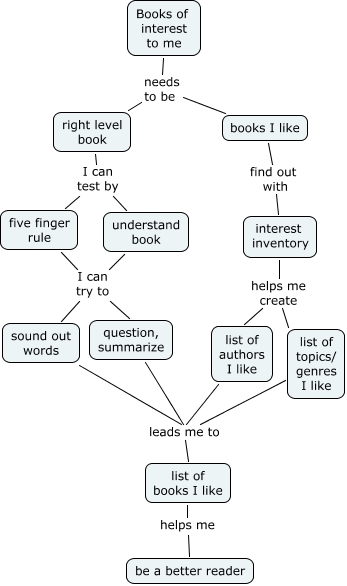 This Concept Map, created with IHMC CmapTools, has information related to: novice student 2, books I like find out with interest inventory, five finger rule I can try to sound out words, understand book I can try to question, summarize, right level book I can test by five finger rule, Books of interest to me needs to be books I like, five finger rule I can try to question, summarize, interest inventory helps me create list of authors I like, Books of interest to me needs to be right level book, list of books I like helps me be a better reader, sound out words leads me to list of books I like, list of topics/ genres I like leads me to list of books I like, question, summarize leads me to list of books I like, understand book I can try to sound out words, interest inventory helps me create list of topics/ genres I like, right level book I can test by understand book, list of authors I like leads me to list of books I like