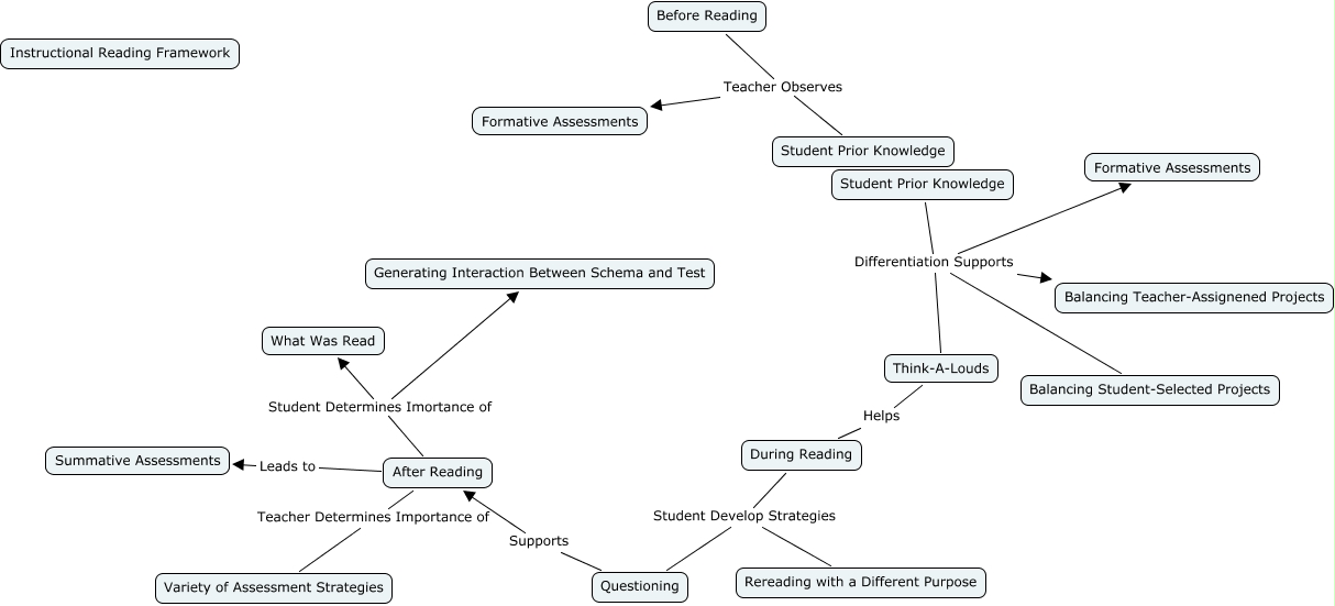 This Concept Map, created with IHMC CmapTools, has information related to: DRAFT 2, After Reading Student Determines Imortance of Generating Interaction Between Schema and Test, Student Prior Knowledge Differentiation Supports Balancing Teacher-Assignened Projects, After Reading Student Determines Imortance of What Was Read, Student Prior Knowledge Differentiation Supports Balancing Student-Selected Projects, Before Reading Teacher Observes Formative Assessments, During Reading Student Develop Strategies Questioning, After Reading Leads to Summative Assessments, Student Prior Knowledge Differentiation Supports Think-A-Louds, Questioning Supports After Reading, During Reading Student Develop Strategies Rereading with a Different Purpose, After Reading Teacher Determines Importance of Variety of Assessment Strategies, Think-A-Louds Helps During Reading, Student Prior Knowledge Differentiation Supports Formative Assessments, Before Reading Teacher Observes Student Prior Knowledge