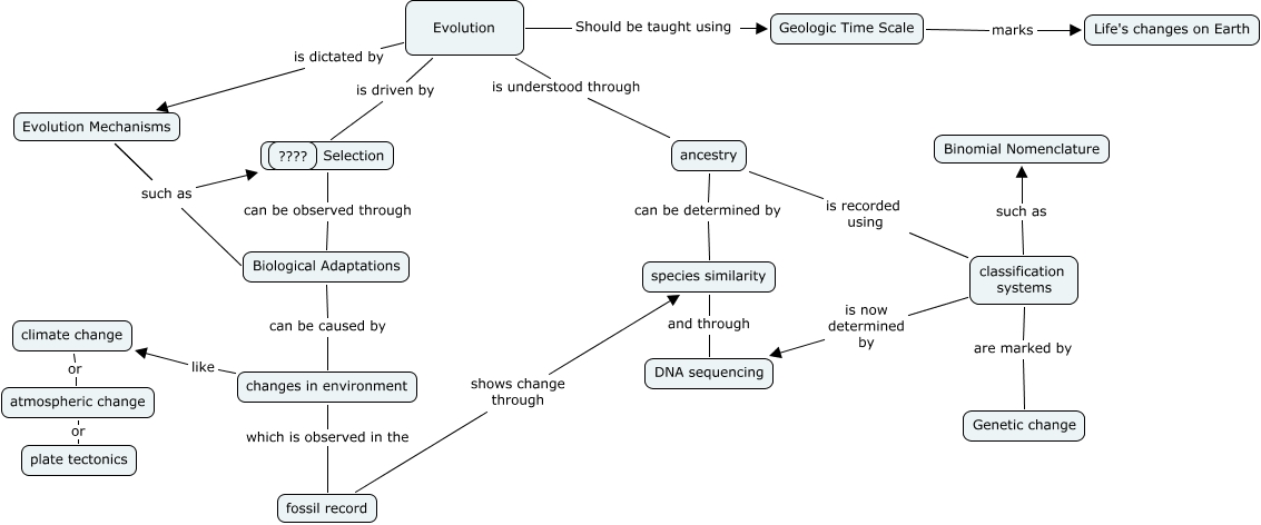 This Concept Map, created with IHMC CmapTools, has information related to: Week 2 Extra Credit Assignment, Evolution is understood through ancestry, climate change or atmospheric change, Evolution Mechanisms such as Natural Selection, Natural Selection can be observed through Biological Adaptations, classification systems are marked by Genetic change, Biological Adaptations can be caused by changes in environment, fossil record shows change through species similarity, Evolution Mechanisms such as Biological Adaptations, ancestry is recorded using classification systems, ancestry can be determined by species similarity, Evolution Mechanisms such as Natural Selection, changes in environment which is observed in the fossil record, Geologic Time Scale marks Life's changes on Earth, classification systems is now determined by DNA sequencing, Evolution is dictated by Evolution Mechanisms, species similarity and through DNA sequencing, Evolution Should be taught using Geologic Time Scale, atmospheric change or plate tectonics, classification systems such as Binomial Nomenclature, changes in environment like climate change