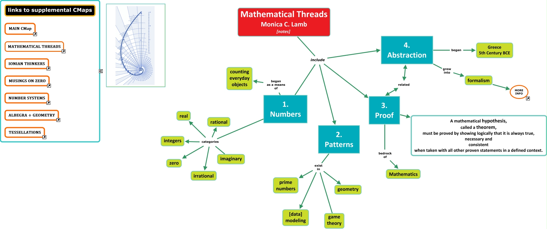 This Concept Map, created with IHMC CmapTools, has information related to: MATH_threads, 2. Patterns exist in game theory, Mathematical Threads Monica C. Lamb [notes] include 3. Proof, 2. Patterns exist in prime numbers, Mathematical Threads Monica C. Lamb [notes] include 2. Patterns, 1. Numbers categories zero, 4. Abstraction related 3. Proof, 4. Abstraction began Greece 5th Century BCE, 1. Numbers categories imaginary, 1. Numbers began as a means of counting everyday objects, 2. Patterns exist in [data] modeling, 3. Proof bedrock of Mathematics, 1. Numbers categories irrational, formalism MORE INFO, 1. Numbers categories integers, 1. Numbers categories real, 1. Numbers categories rational, 4. Abstraction grew into formalism, 2. Patterns exist in geometry, 3. Proof A mathematical hypothesis, called a theorem, must be proved by showing logically that it is always true, necessary and consistent when taken with all other proven statements in a defined context., Mathematical Threads Monica C. Lamb [notes] include 1. Numbers
