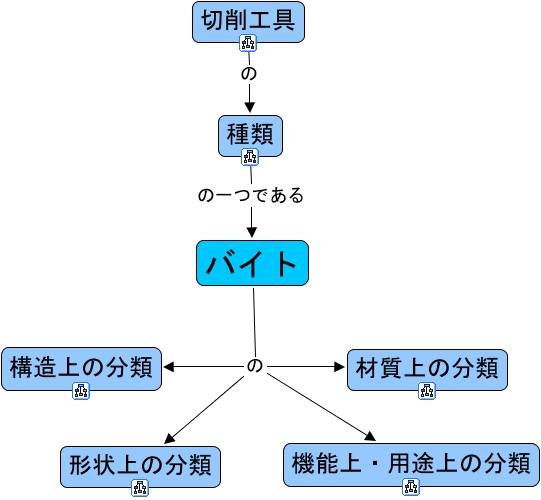 このコンセプトマップに関連する情報: バイト, バイト の 構造上の分類, バイト の 機能上・用途上の分類, バイト の 形状上の分類, バイト の 材質上の分類, 種類 の一つである バイト, 切削工具 の 種類