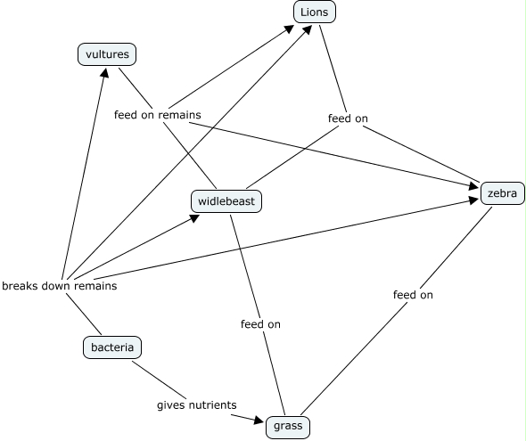 This Concept Map, created with IHMC CmapTools, has information related to: Bebej's Babes, zebra feed on grass, bacteria breaks down remains vultures, widlebeast feed on grass, Lions feed on widlebeast, vultures feed on remains Lions, Lions feed on zebra, vultures feed on remains zebra, vultures feed on remains widlebeast, bacteria breaks down remains Lions, bacteria breaks down remains zebra, bacteria gives nutrients grass, bacteria breaks down remains widlebeast