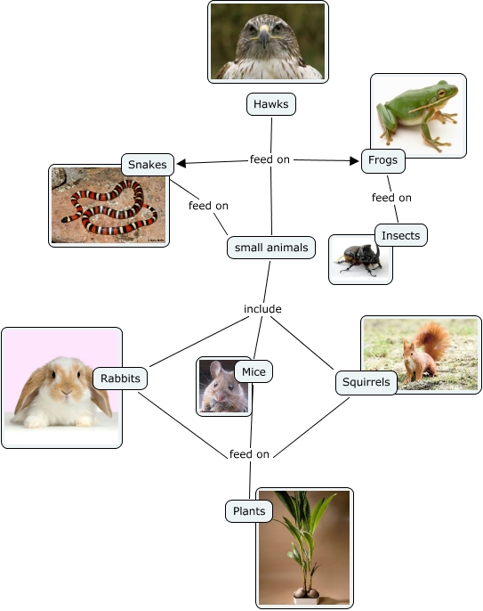This Concept Map, created with IHMC CmapTools, has information related to: Team Leaf.cmap, Snakes feed on small animals, small animals include Mice, small animals include Rabbits, small animals include Squirrels, Squirrels feed on Plants, Hawks feed on small animals, Mice feed on Plants, Hawks feed on Frogs, Hawks feed on Snakes, Rabbits feed on Plants, Frogs feed on Insects