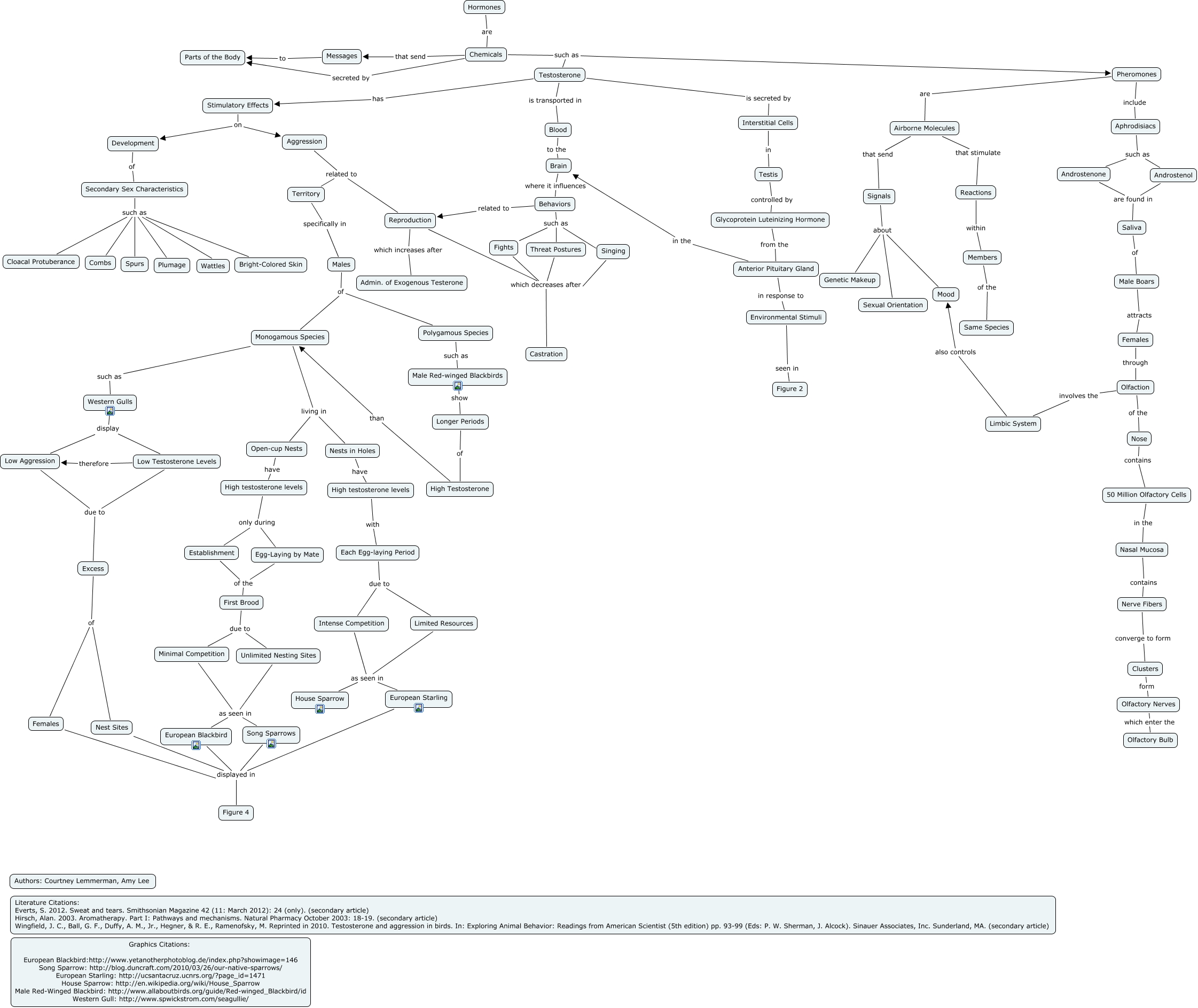 This Concept Map, created with IHMC CmapTools, has information related to: Lee Lemmerman Hormones, Airborne Molecules that stimulate Reactions, Limited Resources as seen in House Sparrow, Unlimited Nesting Sites as seen in European Blackbird, Limited Resources as seen in European Starling, Low Testosterone Levels therefore Low Aggression, Unlimited Nesting Sites as seen in Song Sparrows, Low Testosterone Levels due to Excess, Each Egg-laying Period due to Intense Competition, First Brood due to Minimal Competition