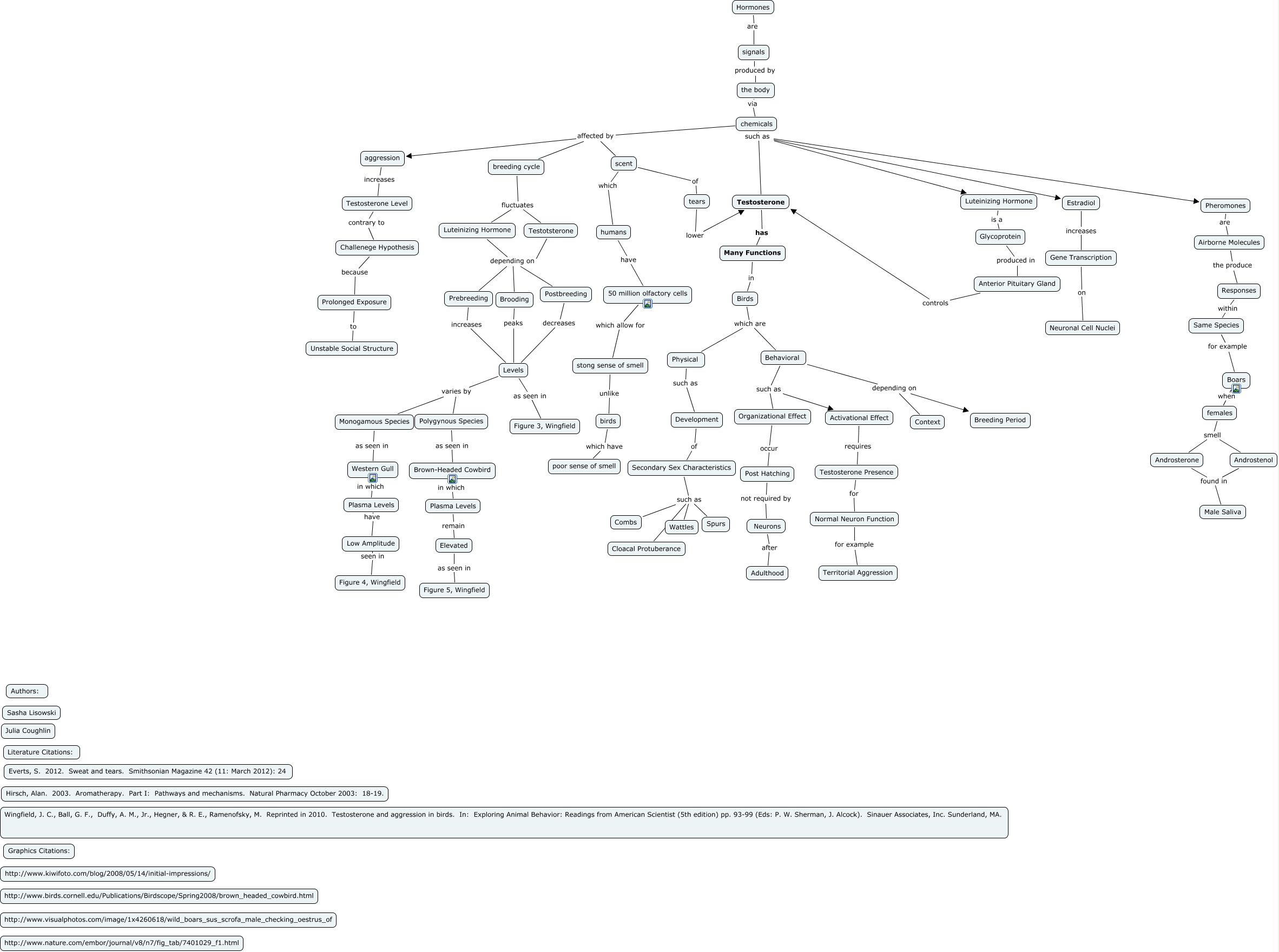 This Concept Map, created with IHMC CmapTools, has information related to: Coughlin Lisowski Hormones, Physical such as Development, chemicals such as Estradiol, Anterior Pituitary Gland controls Testosterone, chemicals affected by scent, Glycoprotein produced in Anterior Pituitary Gland, humans have 50 million olfactory cells, Levels as seen in Figure 3, Wingfield, Behavioral such as Organizational Effect, tears lower Testosterone, chemicals affected by aggression, stong sense of smell unlike birds, Development of Secondary Sex Characteristics, Behavioral such as Activational Effect, Secondary Sex Characteristics such as Cloacal Protuberance, aggression increases Testosterone Level, Hormones are signals, Brown-Headed Cowbird in which Plasma Levels, Airborne Molecules the produce Responses, Activational Effect requires Testosterone Presence, Birds which are Behavioral