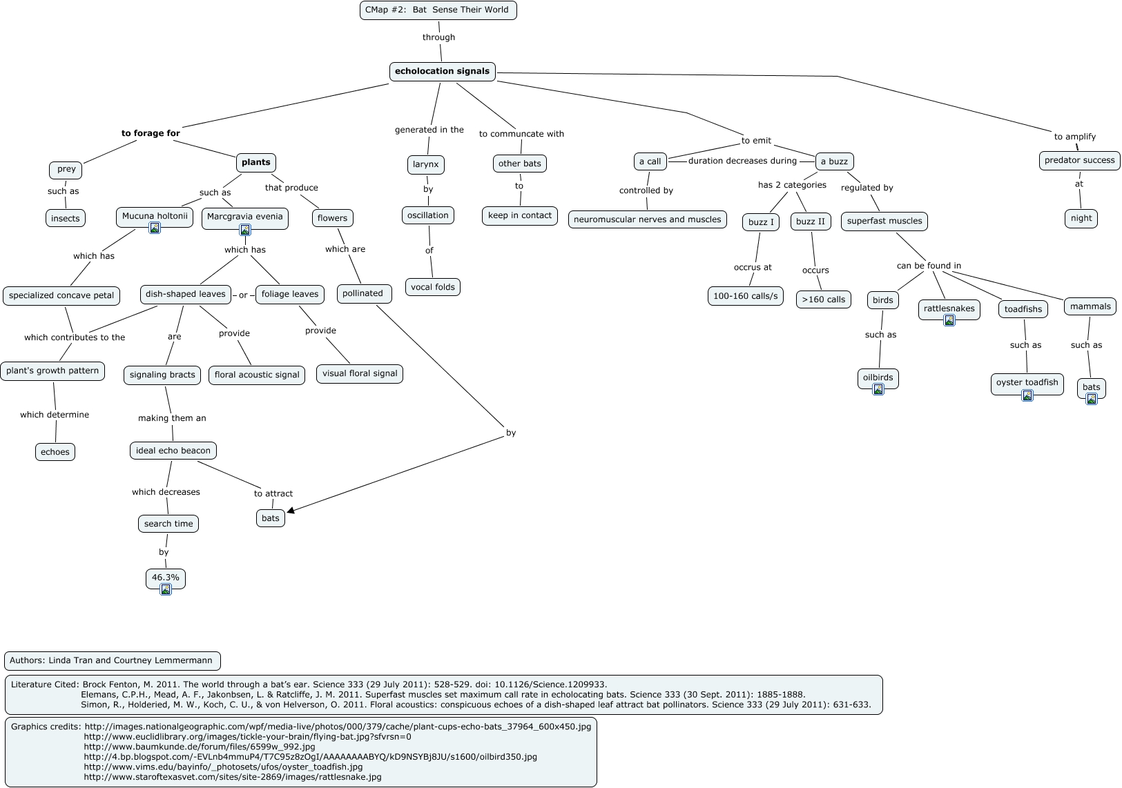 This Concept Map, created with IHMC CmapTools, has information related to: Tran Linda Bat Sensory, plants such as Marcgravia evenia, a buzz has 2 categories buzz I, dish-shaped leaves provide floral acoustic signal, plants such as Mucuna holtonii, dish-shaped leaves or foliage leaves, a buzz has 2 categories buzz II, echolocation signals generated in the larynx, specialized concave petal which contributes to the dish-shaped leaves, a buzz regulated by superfast muscles, other bats to keep in contact, plant's growth pattern which contributes to the dish-shaped leaves, CMap #2: Bat Sense Their World through echolocation signals, birds such as oilbirds, a call controlled by neuromuscular nerves and muscles, echolocation signals to forage for plants, signaling bracts making them an ideal echo beacon, foliage leaves provide visual floral signal, flowers which are pollinated, pollinated by bats, superfast muscles can be found in toadfishs