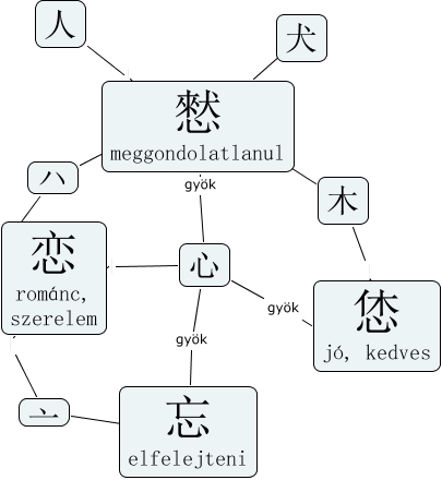 This Concept Map, created with IHMC CmapTools, has information related to: PGkokoro.png, 亠 忘 elfelejteni, 亠 恋 románc, szerelem, ハ 恋 románc, szerelem, 人 憖 meggondolatlanul, 犬 憖 meggondolatlanul, 木 恷 jó, kedves, 心 gyök 憖 meggondolatlanul, 心 gyök 忘 elfelejteni, 心 gyök 恷 jó, kedves, 木 憖 meggondolatlanul, 心 恋 románc, szerelem, ハ 憖 meggondolatlanul