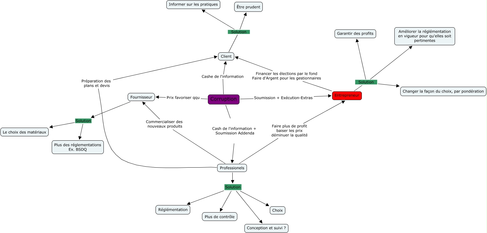 Cette carte de concepts créée avec IHMC CmapTools traite de: Corruption, Corruption Cash de l'information + Soumission Addenda Professionels, Client Solution Être prudent, Fournisseur Solution Le choix des matériaux, Entrepreneur Solution Changer la façon du choix, par pondération, Professionels Solution Réglémentation, Corruption Soumission + Exécution-Extras Entrepreneur, Corruption Cashe de l'information Client, Professionels Faire plus de profit baiser les prix déminuer la qualité Entrepreneur, Fournisseur Solution Plus des réglementations Ex. BSDQ, Corruption Prix favoriser qqu Fournisseur, Professionels Préparation des plans et devis Client, Professionels Commercialiser des nouveaux produits Fournisseur, Professionels Solution Conception et suivi ?, Entrepreneur Solution Améliorer la réglémentation en vigueur pour qu'elles soit pertinentes, Entrepreneur Solution Garantir des profits, Entrepreneur Financer les élections par le fond Faire d'Argent pour les gestionnaires Client, Professionels Solution Choix, Client Solution Informer sur les pratiques, Professionels Solution Plus de contrôle