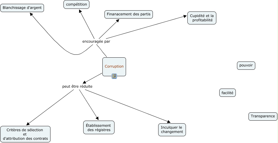 Cette carte de concepts créée avec IHMC CmapTools traite de: Exercice en équipe, Corruption peut être réduite Inculquer le changement, Corruption encouragée par compétition, Corruption encouragée par Finanacement des partis, Corruption peut être réduite Établissement des régistres, Corruption peut être réduite Critères de sélection et d'attribution des contrats, Corruption encouragée par Blanchissage d'argent, Corruption encouragée par Cupidité et la profitabilité
